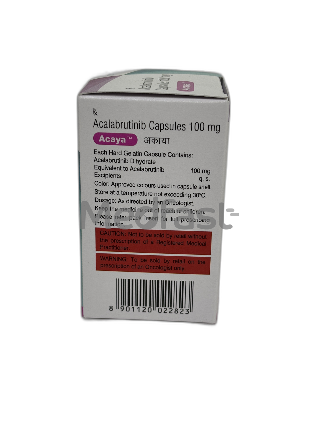 Acaya 100mg Capsule contains Acalabrutinib, an anticancer medication that targets Bruton’s tyrosine kinase (BTK), a protein essential for the survival and spread of certain B-cell malignancies. By blocking BTK, Acaya disrupts signaling pathways that help cancerous B lymphocytes grow and survive, making it effective in treating conditions like mantle cell lymphoma (MCL), chronic lymphocytic leukemia (CLL), and small lymphocytic lymphoma (SLL). These types of cancers, although related, vary in their progression and the sites they affect within the lymphatic system.