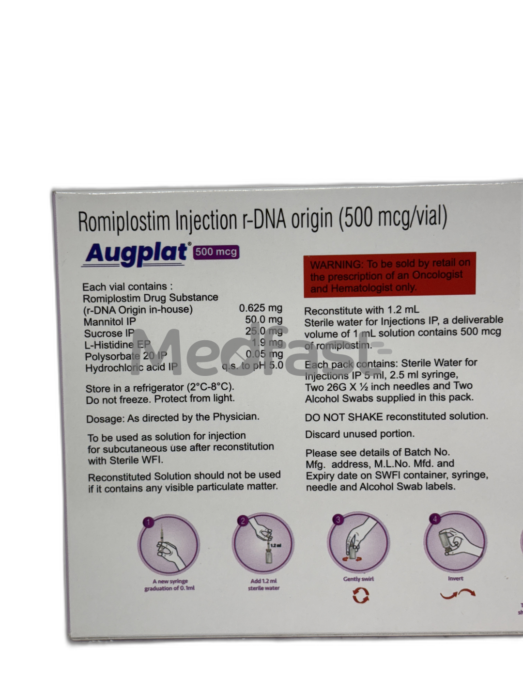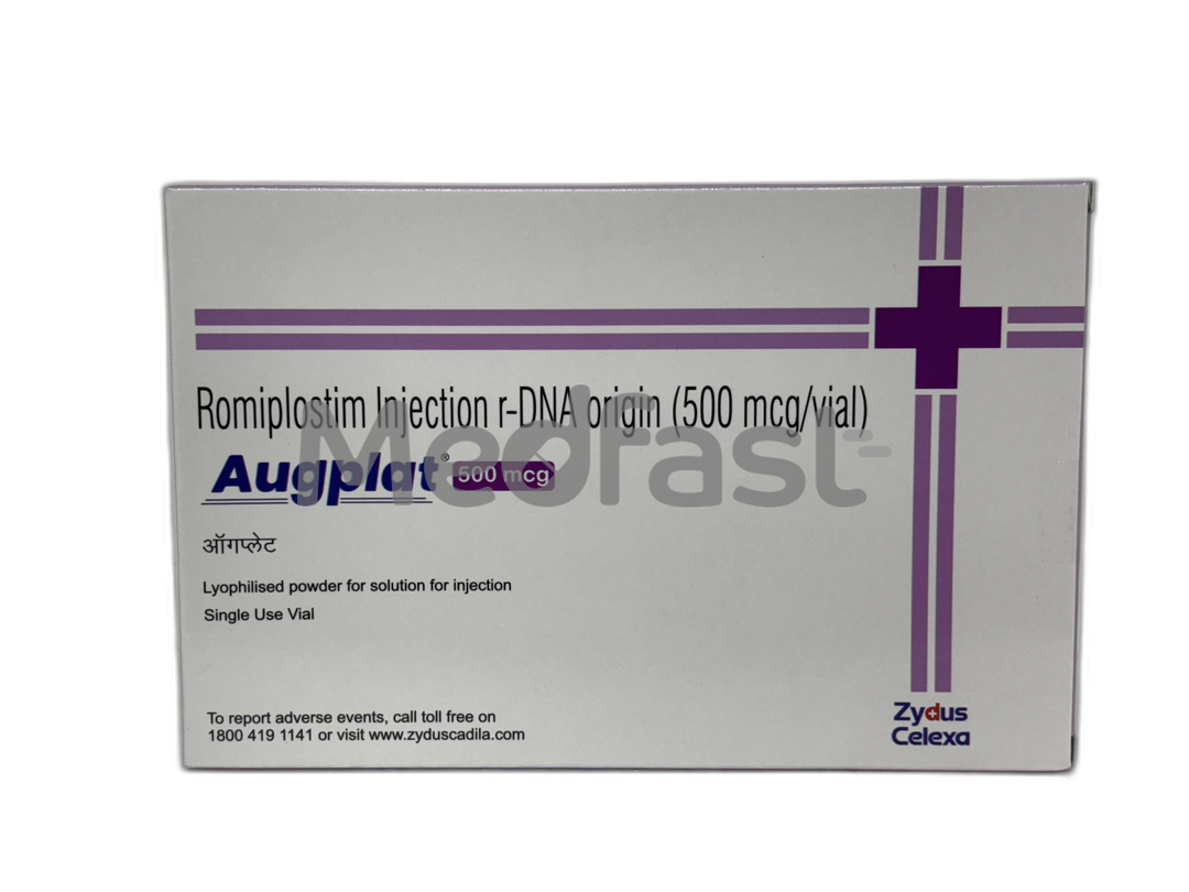 Augplat 500mg injection belongs to the platelet-stimulating agent category, containing the active ingredient Romiplostim. It treats immune primary thrombocytopenia (ITP). ITP occurs when the body’s immune system mistakenly attacks and destroys its own platelets, leading to low platelet counts. This drug is mostly used in adults and children aged 18 years and over with immune primary thrombocytopenia when other treatments have not been effective. It is prescribed when immunoglobulins, corticosteroids, or splenectomy (surgical spleen removal) have not successfully increased platelet counts.