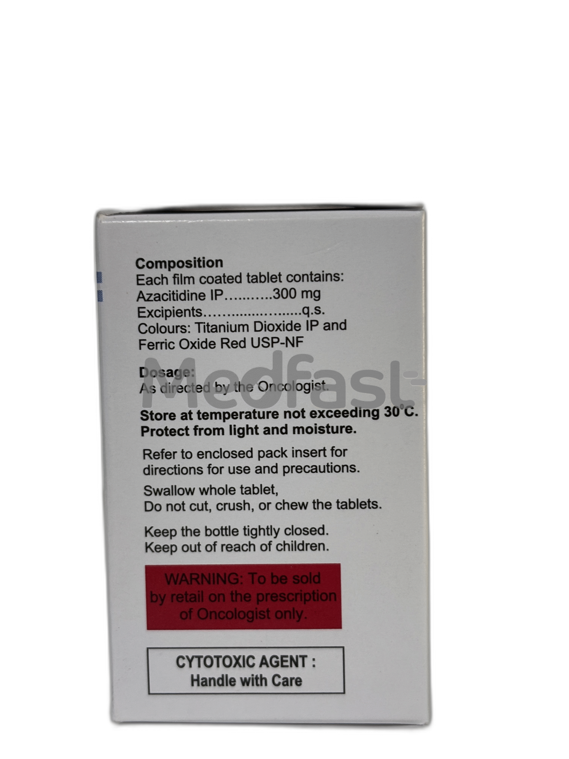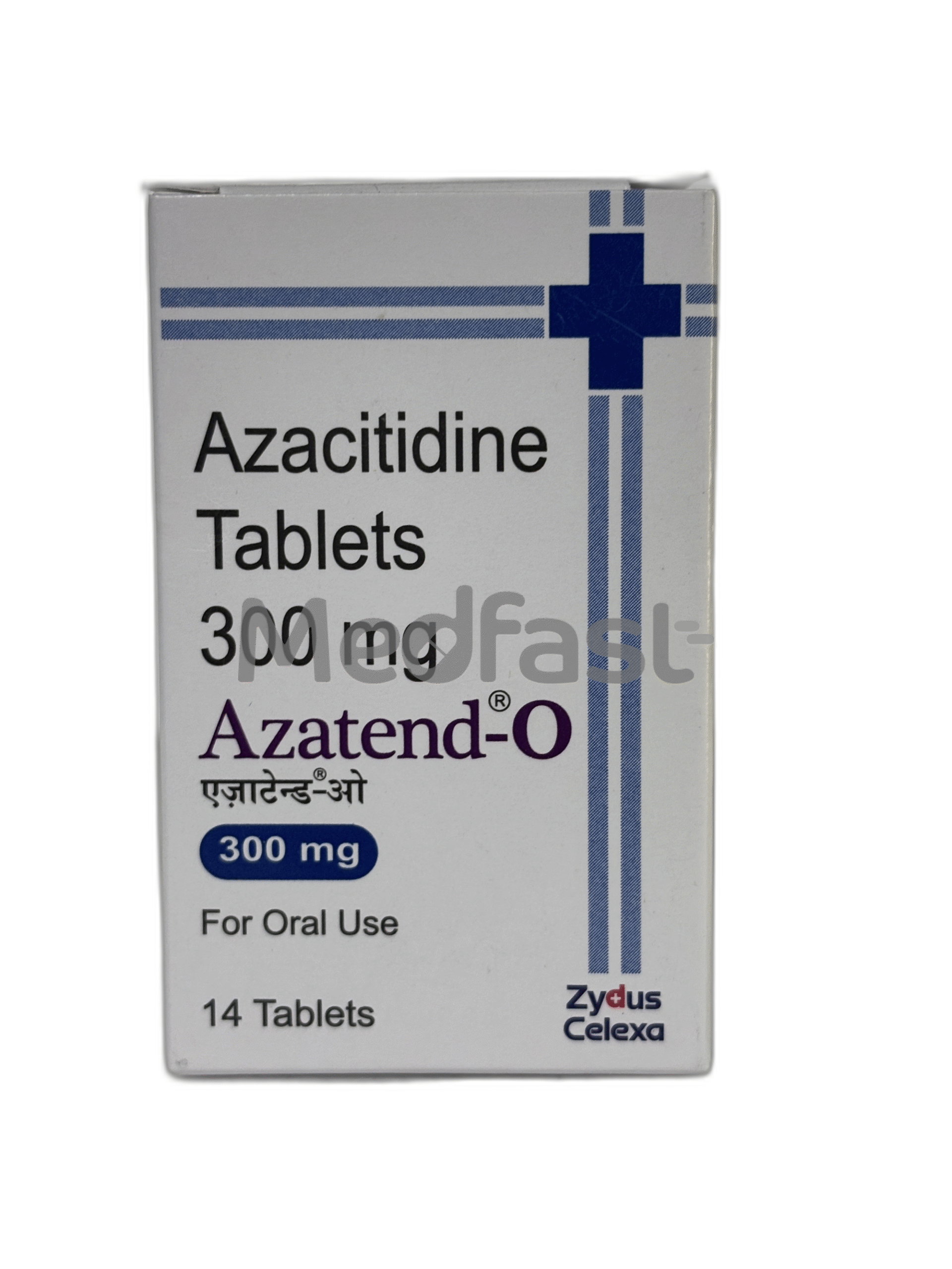 Azatend O 300mg tablet consists of the active ingredient Azacitidine. This medication is specifically utilized for treating adults who have certain blood conditions, namely Myelodysplastic Syndrome (MDS), chronic myelomonocytic leukemia, and Acute Myeloid Leukemia (AML), particularly if these individuals are considered ineligible for a stem cell transplant. In the context of Myelodysplastic Syndrome, the bone marrow experiences a significant lack of proper function, leading to its inability to produce healthy blood cells effectively. Acute Myeloid Leukemia, on the other hand, is a severe type of bone marrow cancer that arises from the premature release of incompletely formed blood cells into the bloodstream. Lastly, chronic myelomonocytic leukemia represents a rare form of blood cancer characterized by an abnormal and increased number of monocytes, which are a specific type of white blood cell.