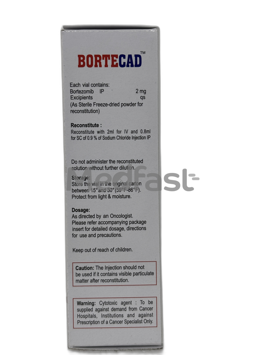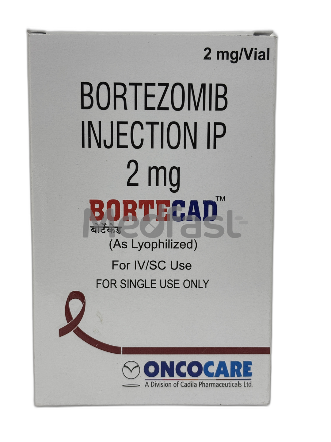 Bortecad 2mg Injection is a chemotherapy medication belonging to the class of proteasome inhibitors, with Bortezomib as its active ingredient. It is indicated for the treatment of multiple myeloma, a cancerous progression of plasma cells primarily found in the bone marrow, and mantle cell lymphoma, a less common cancer affecting the lymph nodes. This medication is often used concomitantly with other chemotherapy medicines such as pegylated liposomal doxorubicin, rituximab, cyclophosphamide, doxorubicin, dexamethasone, prednisolone, or thalidomide, particularly for patients who have not yet started treatment and are ineligible for a blood stem cell transplant.