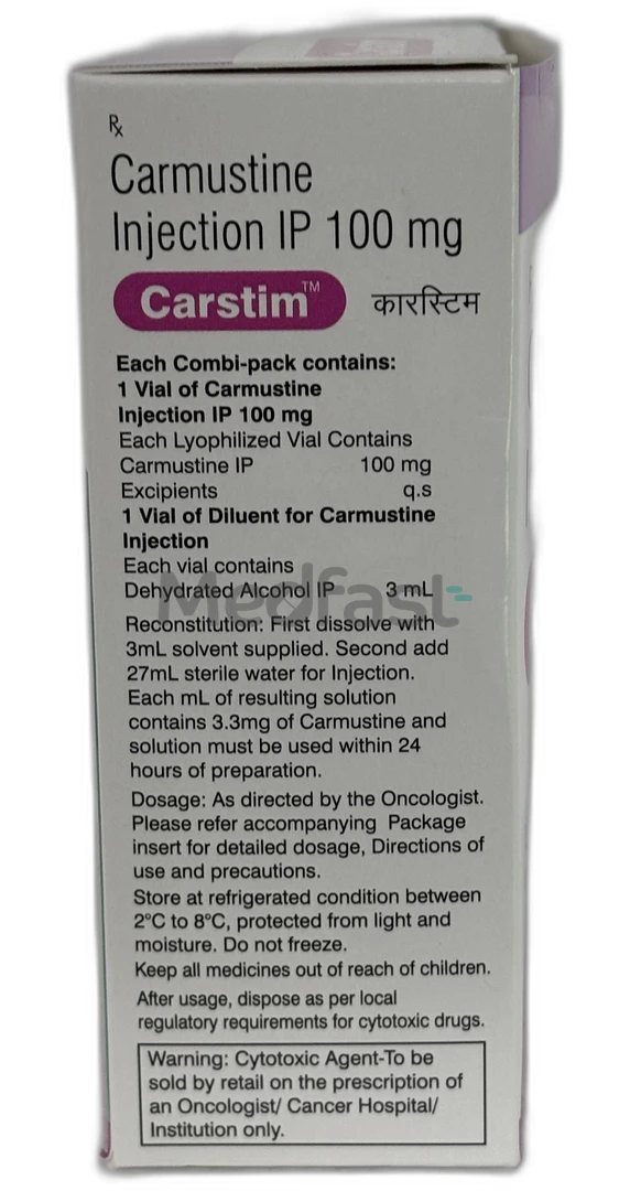 Carstim 100 mg Combipack Injection 1’s is a chemotherapeutic agent utilized for treating brain tumors. A tumor is characterized as a solid mass of tissue resulting from the abnormal proliferation of cells. A brain tumor represents a serious medical condition where cells, whether cancerous or non-cancerous, grow irregularly within the brain. Additionally, Carstim 100 mg Combipack Injection 1’s is employed in the treatment of multiple myeloma alongside prednisone, as well as Hodgkin’s Disease and non-Hodgkin’s Disease in conjunction with other approved medications.