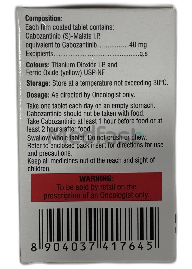 Cazanat 40mg tablet is an antineoplastic medication that contains Cabozantinib as its active ingredient. It falls under the category of tyrosine kinase inhibitors. In adults, it is prescribed for advanced kidney cancer and locally advanced or metastatic differentiated thyroid cancer. Additionally, it is utilized for liver cancer when Sorafenib (an anticancer drug) is ineffective. Typically, this medication is administered alongside Nivolumab for advanced kidney cancer. It is not advisable for individuals under 18 years of age.