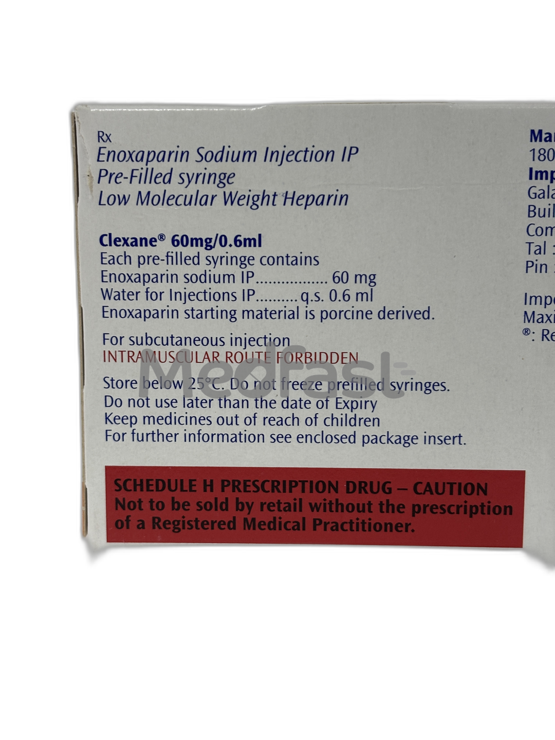 Clexane 60mg Injection (0.6ml Each) is an anticoagulant used to prevent and treat harmful blood clots. It stops the existing clots from getting any bigger and restricts the formation of any new clot. It is also helpful in the prevention of blood clots in veins, a condition called deep vein thrombosis, and pulmonary embolism.