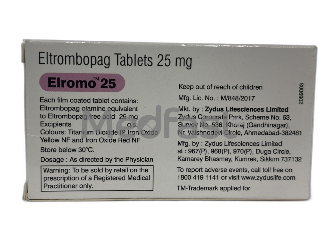 Elromo 25mg Tablet is an anticoagulant medication that belongs to the class of thrombopoietin (TPO) receptor agonists and contains the active ingredient Eltrombopag. It is primarily prescribed to treat low platelet counts caused by conditions such as primary immune thrombocytopenia (ITP), a disorder in which the body’s immune system attacks its own platelets, and hepatitis C virus (HCV) infection. In ITP, low platelet levels can lead to increased risks of bruising and severe bleeding. This medication is also used in adults with severe aplastic anaemia, a condition where the bone marrow fails to produce enough blood cells, resulting in low counts of red cells, white cells, and platelets.