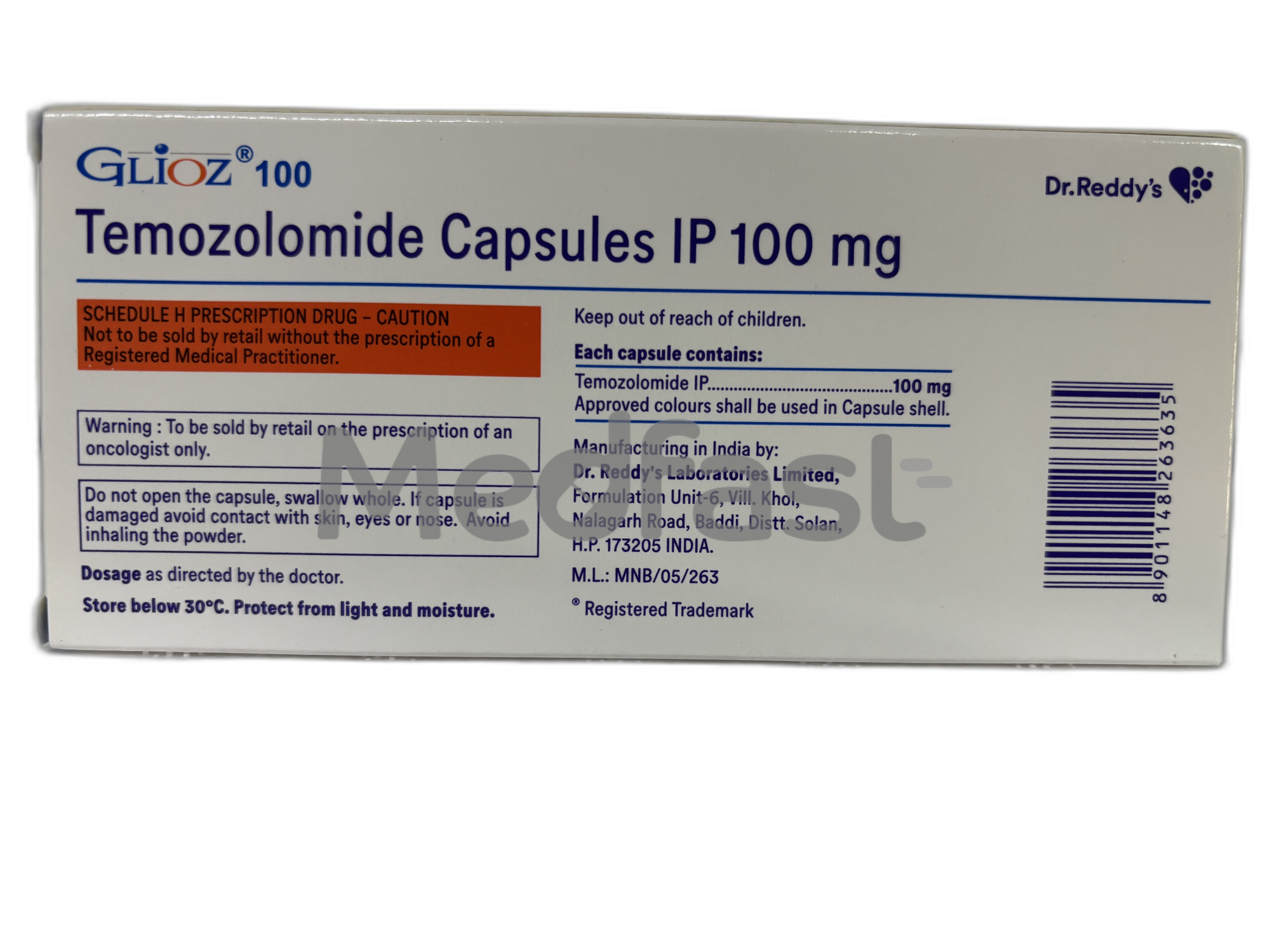 Glioz 100mg Capsule, containing temozolomide, is an antineoplastic agent used to treat brain cancers. Specifically, it’s prescribed for glioblastoma multiforme in adults and malignant gliomas, including glioblastoma multiforme or anaplastic astrocytoma, in patients aged three and older. Glioblastoma and anaplastic astrocytoma are aggressive brain cancers with low survival rates. Anaplastic astrocytoma is typically treated with Glioz 100mg Capsule or radiotherapy after a biopsy, while glioblastoma multiforme is managed with a combination of radiotherapy and Glioz 100mg Capsule, which then continues as maintenance therapy.