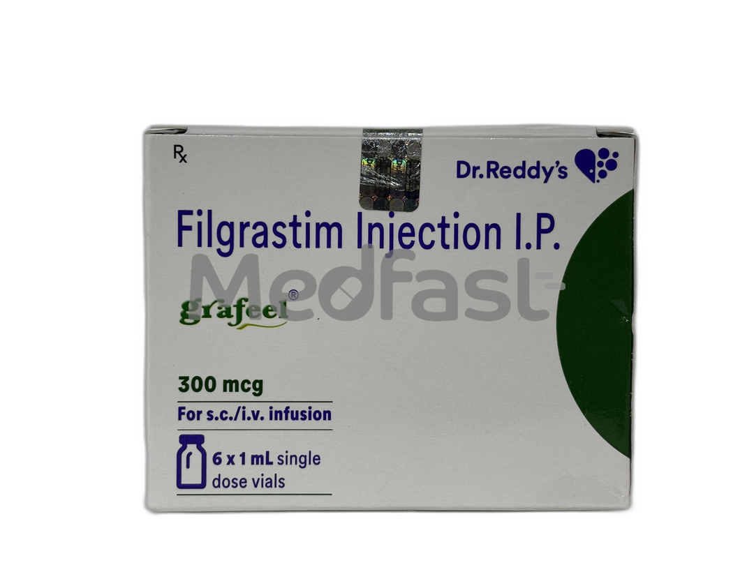 Grafeel 300mcg injection contains filgrastim, a white blood cell growth factor (granulocyte-colony stimulating factor). It is an FDA-approved medication designed to mitigate the risk of febrile neutropenia (fever or infection associated with a low white blood cell count) and to shorten the duration of neutropenia (a low white blood cell count) in individuals undergoing chemotherapy for non-myeloid cancers. This injection is also utilized to boost white blood cell counts and reduce the duration of fever in patients with acute myeloid leukemia.