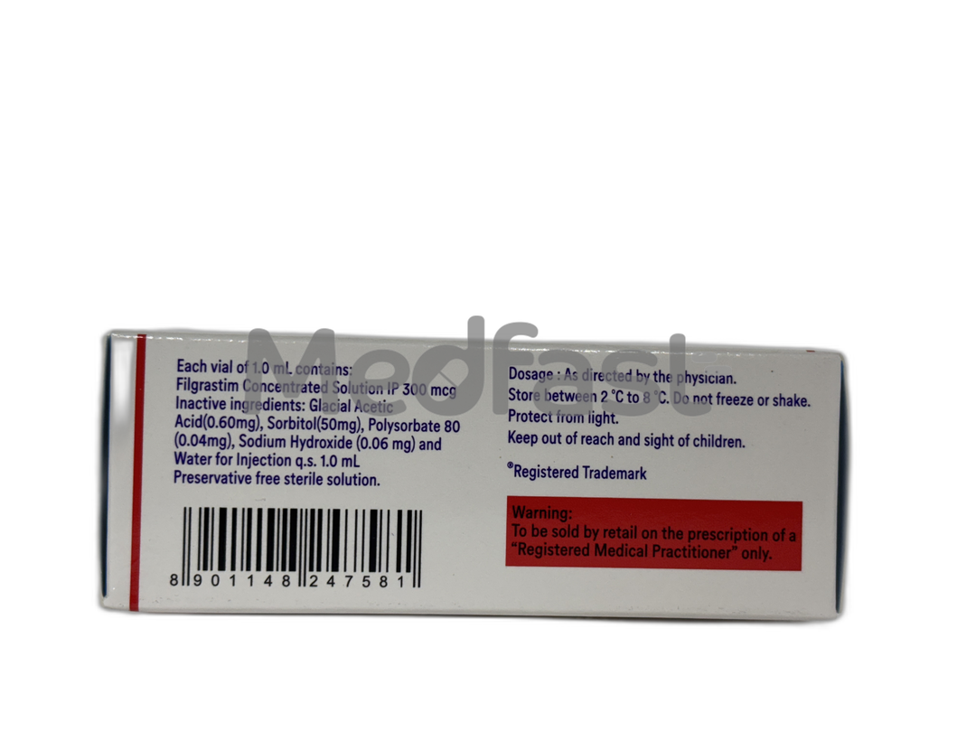 Grastim 300mcg Injection Vial contains the active constituent filgrastim. It is a white blood cell growth factor (granulocyte-colony stimulating factor) approved by the FDA to decrease the risk of developing febrile neutropenia ( occurrence of fever or infection associated with low WBC count) and to reduce the duration of neutropenia (low white blood cell count) in people who have non-myeloid cancer and are receiving chemotherapy drugs. It is also used to increase the number of WBC and decrease the length of time of fever in people with acute myeloid leukemia.