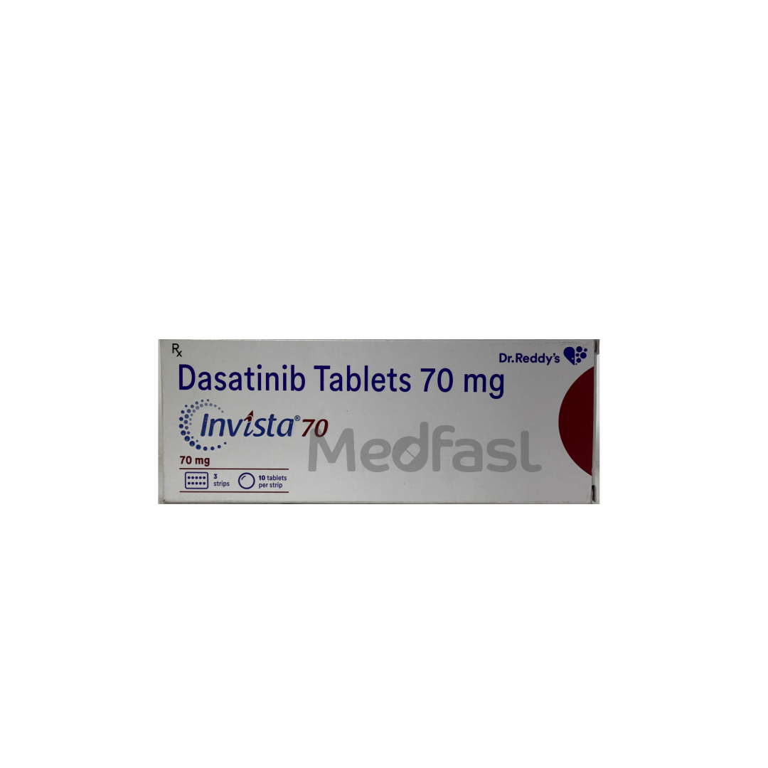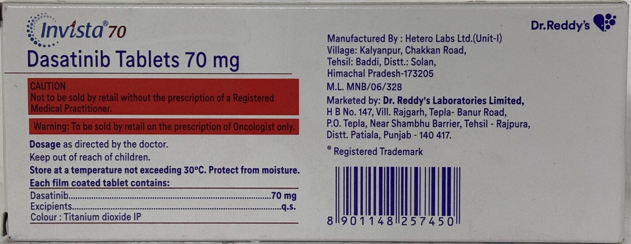 Invista 70mg tablet contains Dasatinib as its active ingredient. It is primarily used to treat certain types of blood cancers, specifically in adults and children over the age of one. This medication is indicated for patients with Philadelphia chromosome-positive (Ph+) chronic myeloid leukemia (CML) in the chronic phase who are newly diagnosed, as well as for those with Ph+ acute lymphoblastic leukemia (ALL) who have not responded to prior treatments. Chronic myeloid leukemia is a cancer of the white blood cells caused by a genetic abnormality known as the Philadelphia chromosome, leading to an excessive production of abnormal white cells. Acute lymphoblastic leukemia, more common in children, causes immature lymphocytes to multiply uncontrollably and survive longer than they should, disrupting normal blood function.