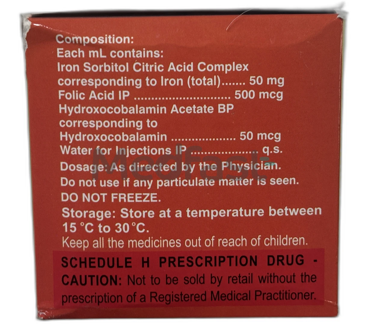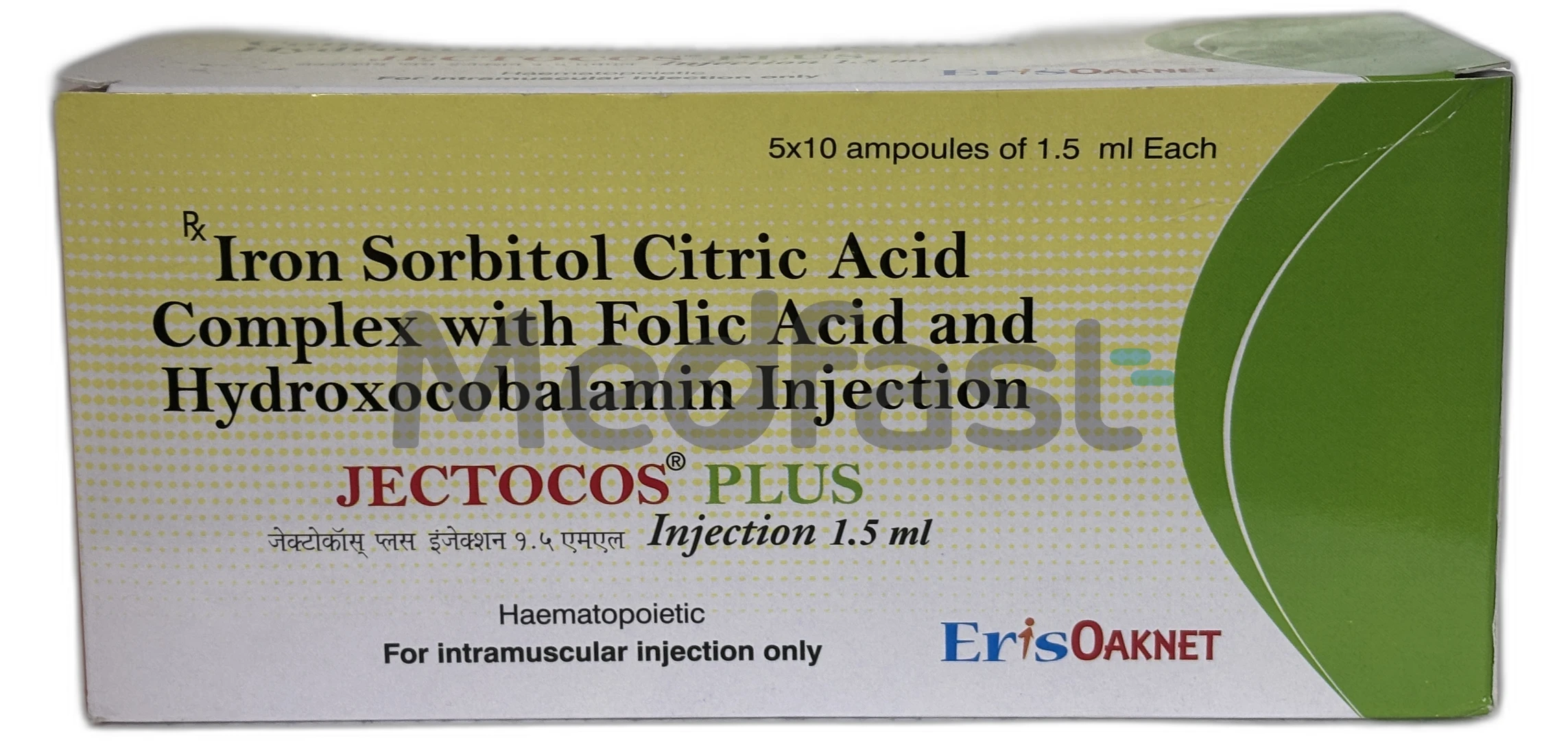 Jectocos Plus Injection 1.5ml is a blend of vitamins and minerals. Iron helps restore the iron reserves in your body and addresses iron deficiency. Cyanocobalamin is crucial for the production of red blood cells and the effective operation of the nervous system. Folic acid plays a vital role in DNA synthesis, cell division, and the creation of red blood cells.