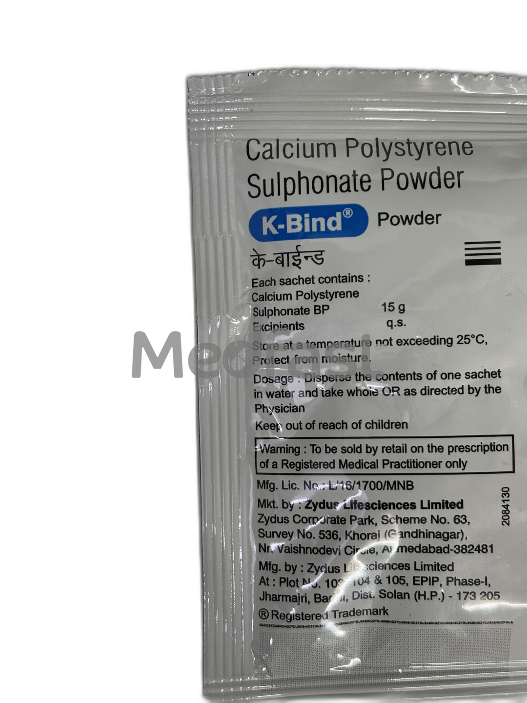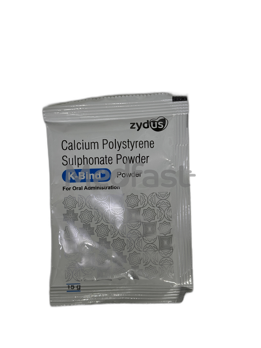 K-Bind Powder, containing the active ingredient calcium polystyrene sulphonate, is a therapeutic agent classified under potassium binders. It is primarily used to manage hyperkalemia—a condition characterized by elevated potassium levels in the blood—which often arises in patients with severely reduced or absent urine output, such as those experiencing anuria or severe oliguria. Additionally, it serves a critical role in helping dialysis patients maintain safe potassium levels, thereby supporting proper heart and muscle function.