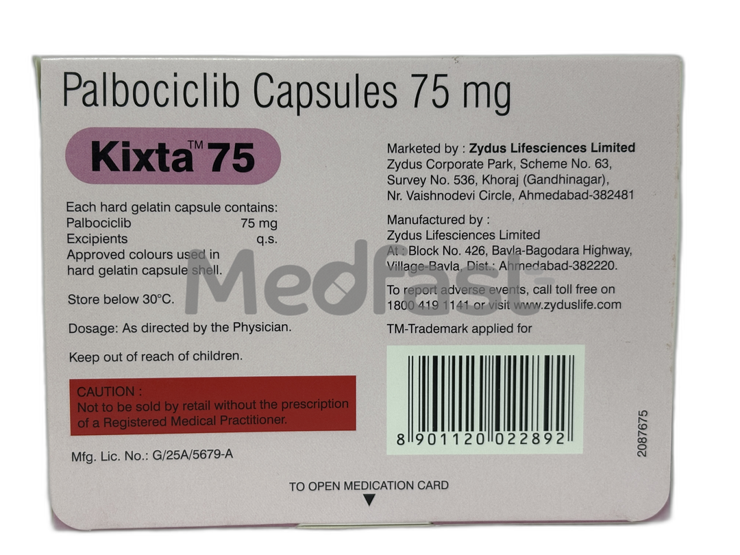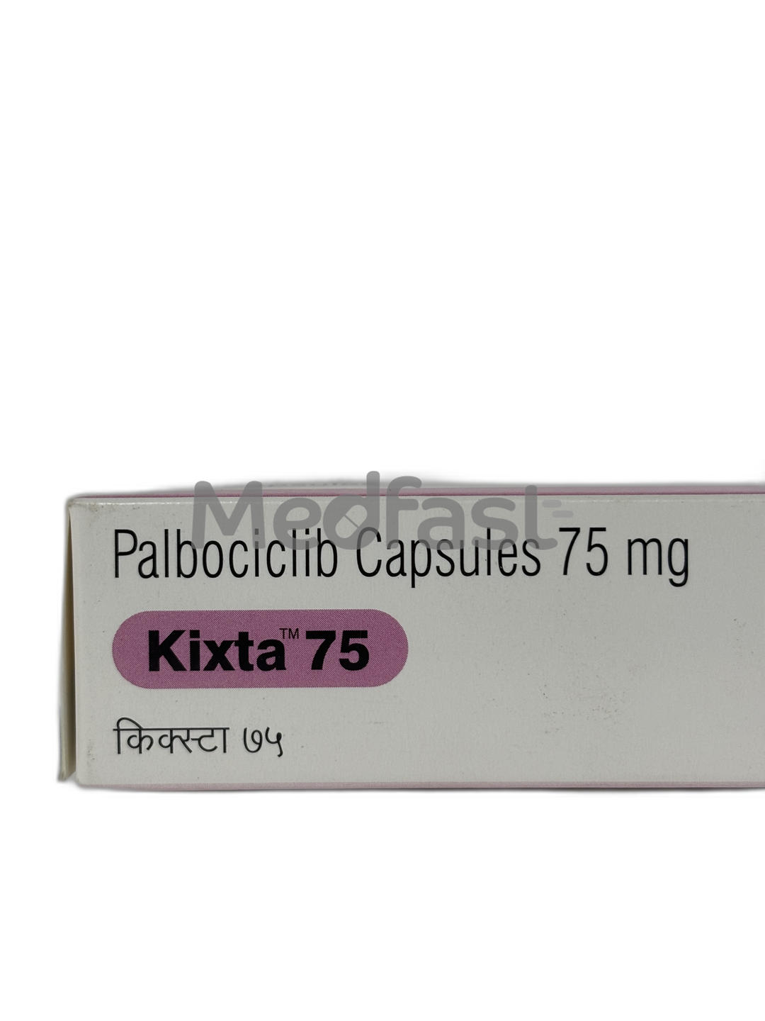 Kixta 75mg Capsule is a targeted therapy medication containing palbociclib as its active constituent. It belongs to the class of anticancer medications known as cyclin-dependent kinase inhibitors. This medicine is used to treat hormone receptor-positive, human epidermal growth factor 2 negative (HR+/HER2-) advanced or metastatic breast cancer (meaning the cancer has spread to other parts of the body). Cancer is a condition characterized by the uncontrolled and abnormal multiplication of cells. Kixta 75mg Capsule is typically given in combination with certain other anticancer medications.