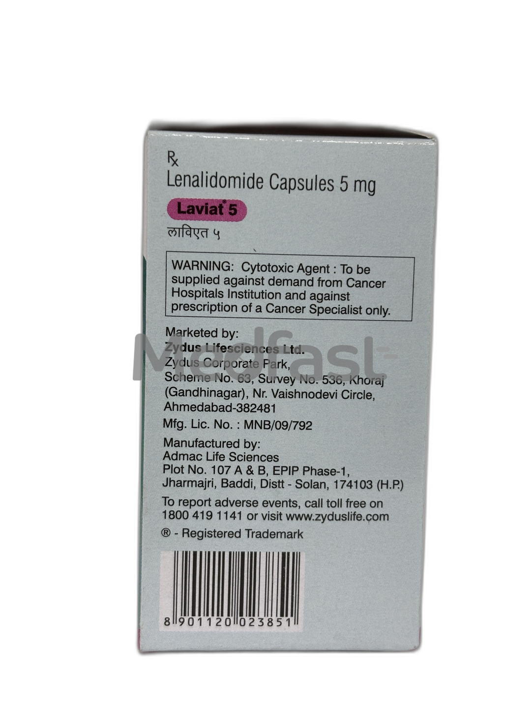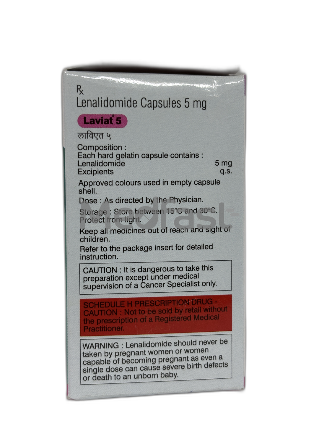 Laviat 5mg Capsule belongs to the important group of medicines known as Immunomodulatory agents. It contains the potent active ingredient Lenalidomide. This medication is specifically indicated to treat adults diagnosed with multiple myeloma, mantle cell lymphoma, myelodysplastic syndrome, and follicular lymphoma. Multiple myeloma refers to the cancerous progression of plasma cells that are predominantly found in the bone marrow. These abnormal cells accumulate in the bone marrow and divide uncontrollably. While this type of cancer cannot be entirely cured, its symptoms can certainly be significantly alleviated. Myelodysplastic Syndrome encompasses a group of various blood and bone marrow diseases where the blood cells become abnormal and consequently do not function properly. Mantle cell lymphoma is a less common but serious type of cancer that primarily affects the lymph nodes. Follicular lymphoma is characterized as a slow-growing cancer that impacts the B cells within the immune system.