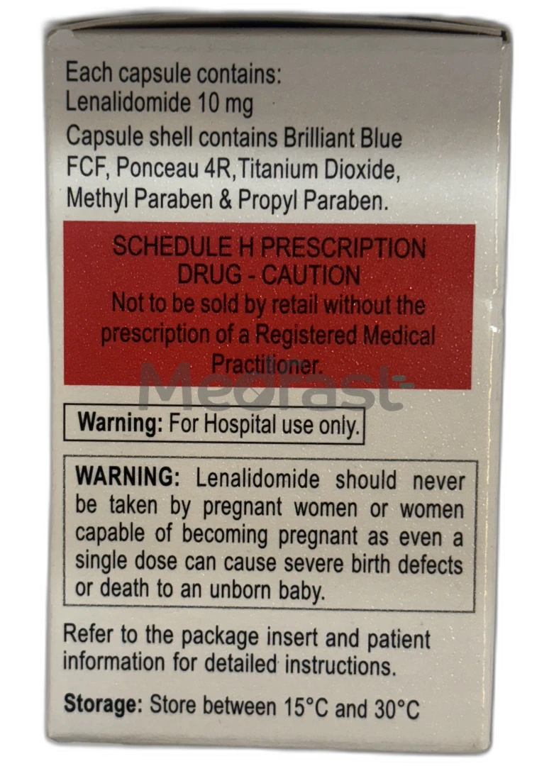 Lenalid 10mg Capsule is classified as an Immunomodulatory agent. It contains Lenalidomide as its active ingredient. This medication is prescribed for adults suffering from multiple myeloma, mantle cell lymphoma, myelodysplastic syndrome, and follicular lymphoma. Multiple myeloma is characterized by the malignant growth of plasma cells in the bone marrow, where these cells proliferate uncontrollably. While this cancer is not curable, its symptoms can be managed. Myelodysplastic Syndrome encompasses a range of blood and bone marrow disorders that lead to the production of abnormal blood cells that do not function correctly. Mantle cell lymphoma is a rarer form of cancer that impacts the lymph nodes, whereas follicular lymphoma is a slow-progressing cancer affecting B cells.