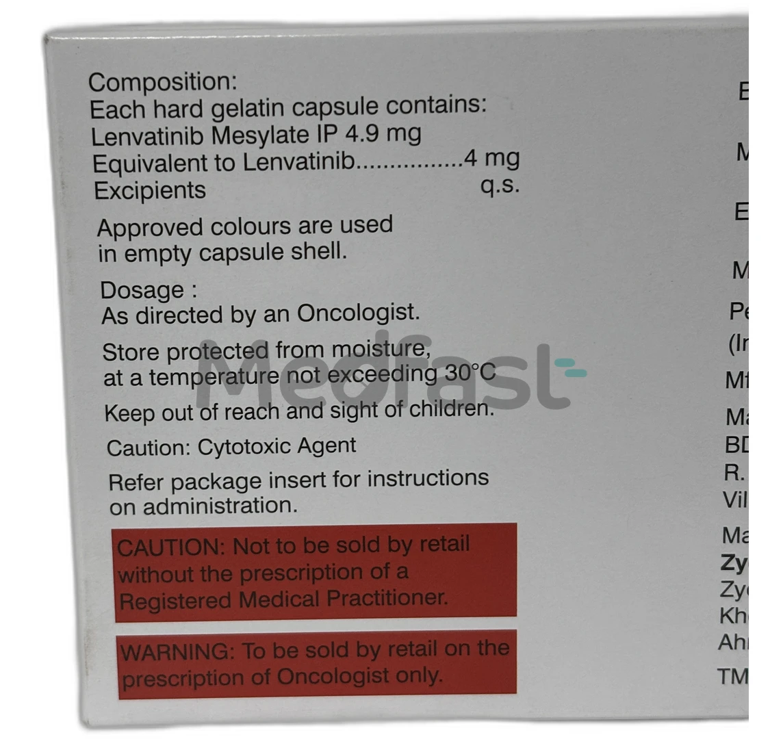 Lenced 4mg Capsule contains the active ingredient Lenvatinib. This medication is a tyrosine kinase inhibitor used for progressive or advanced thyroid cancer when radioactive iodine therapy is ineffective. Additionally, it is prescribed for liver cancer patients who have not received prior treatment and are not candidates for surgical intervention.