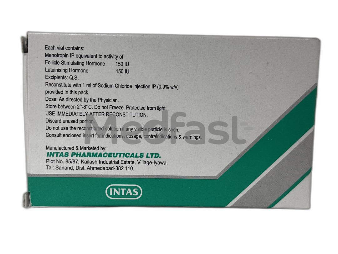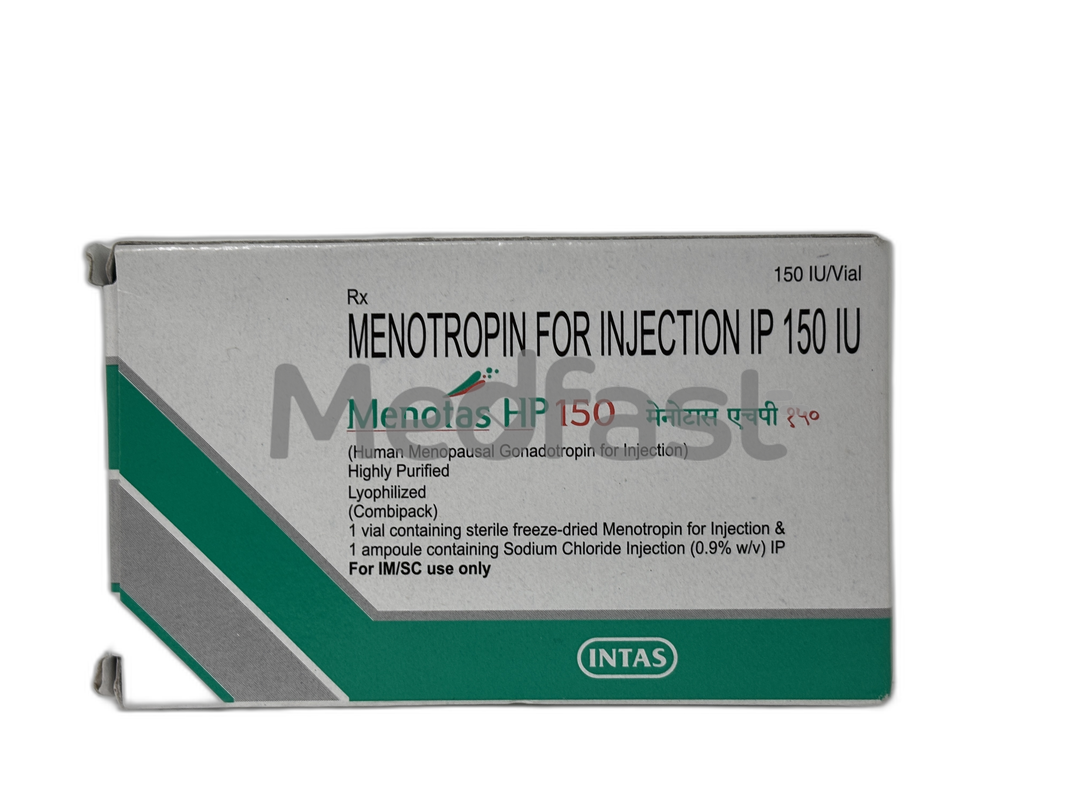 Menotas HP 150IU Injection contains the active substance Menotrophin. It is an ovulation stimulator that belongs to the group of medications called gonadotropins. It is a highly purified mixture of follicle-stimulating hormone (FSH) and luteinising hormone (LH). They are natural hormones produced in both males and females. They help the reproductive organs to work normally.