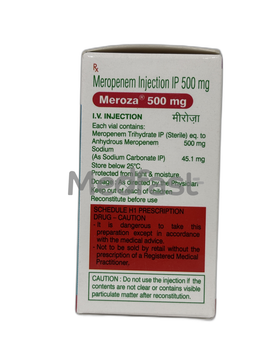 Meroza 500mg Injection is a potent antibiotic that is specifically used to treat severe infections affecting various parts of the body, including the skin, lungs, stomach, urinary tract, blood, and brain (for example, meningitis). It functions by effectively killing the bacteria that are responsible for causing these problems. However, it is important to understand that this medication will not treat a viral infection.