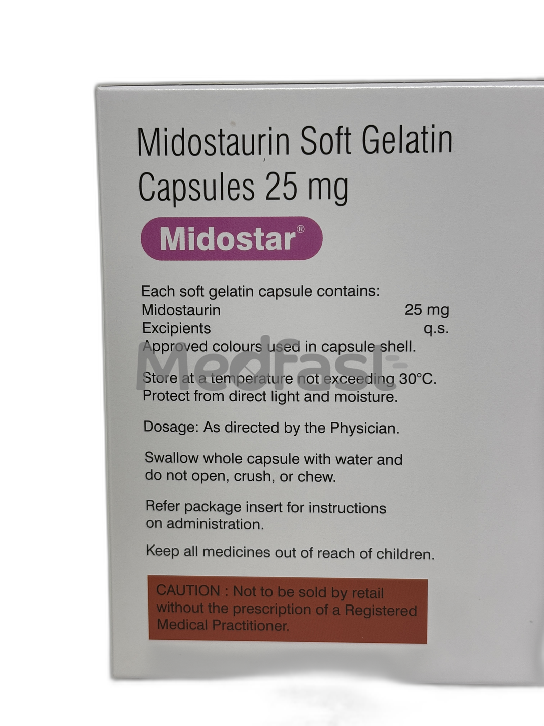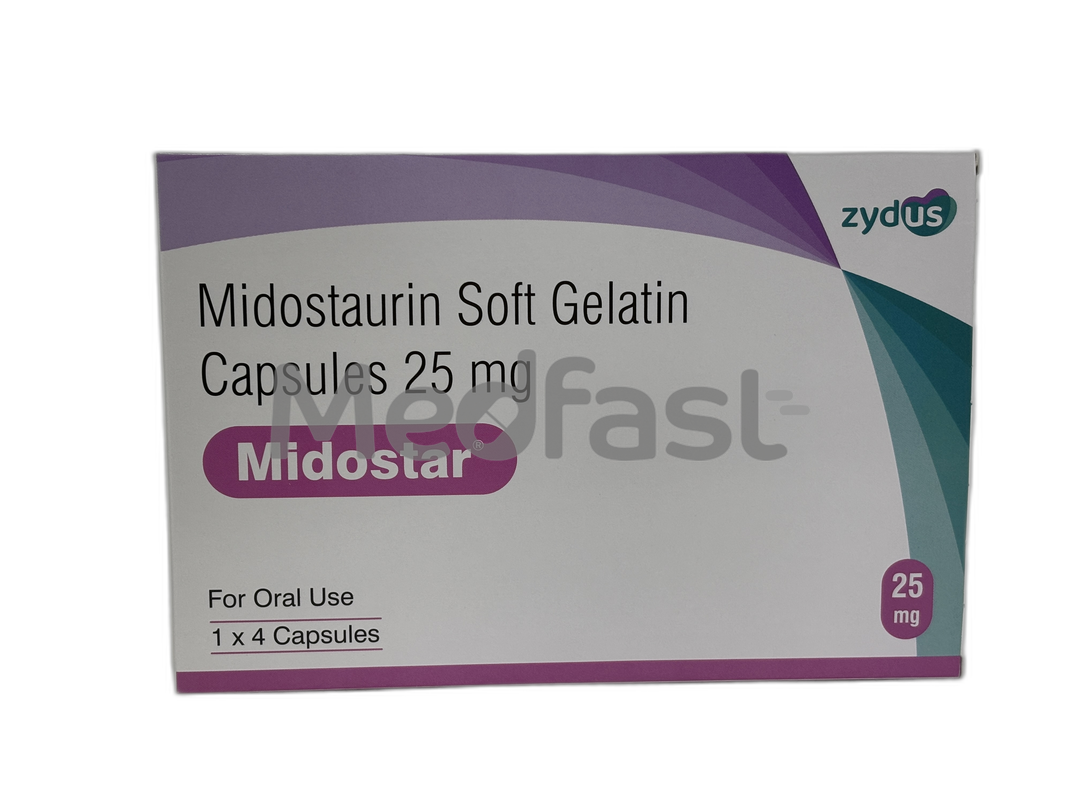 Midostar 25mg capsule is a kinase inhibitor that effectively blocks the activity of several receptor tyrosine kinases. Its primary action targets abnormal cells that express mutations in the FLT3 gene, a mutation commonly found in acute myeloid leukemia (AML). By inhibiting these mutant kinases, Midostar interferes with the signaling pathways that drive the excessive growth and division of these cancerous cells. As a result, it slows down or halts the proliferation of the abnormal cells, helping to restore a more balanced production of healthy blood cells and supporting the effectiveness of accompanying chemotherapy treatments.
