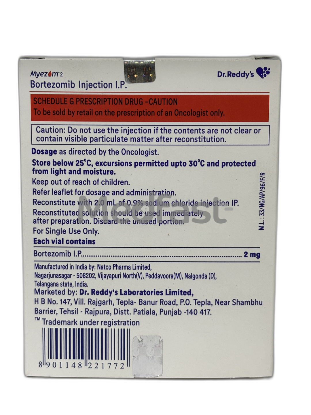 Myezom 2mg Injection is a specialized chemotherapy medication that belongs to the important class of medicines known as proteasome inhibitors. It consists of the active ingredient Bortezomib. This injection is specifically indicated for the treatment of both multiple myeloma and mantle cell lymphoma. Multiple myeloma refers to the cancerous progression of plasma cells that are predominantly found in the bone marrow, where these cells proliferate abnormally. Mantle cell lymphoma is a less common but serious type of cancer primarily affecting the lymph nodes. This medication is often used concomitantly, or in combination, with other chemotherapy medicines such as pegylated liposomal doxorubicin, rituximab, cyclophosphamide, doxorubicin, dexamethasone, prednisolone, or thalidomide, particularly for patients who have not yet started treatment and are ineligible for a blood stem cell transplant.