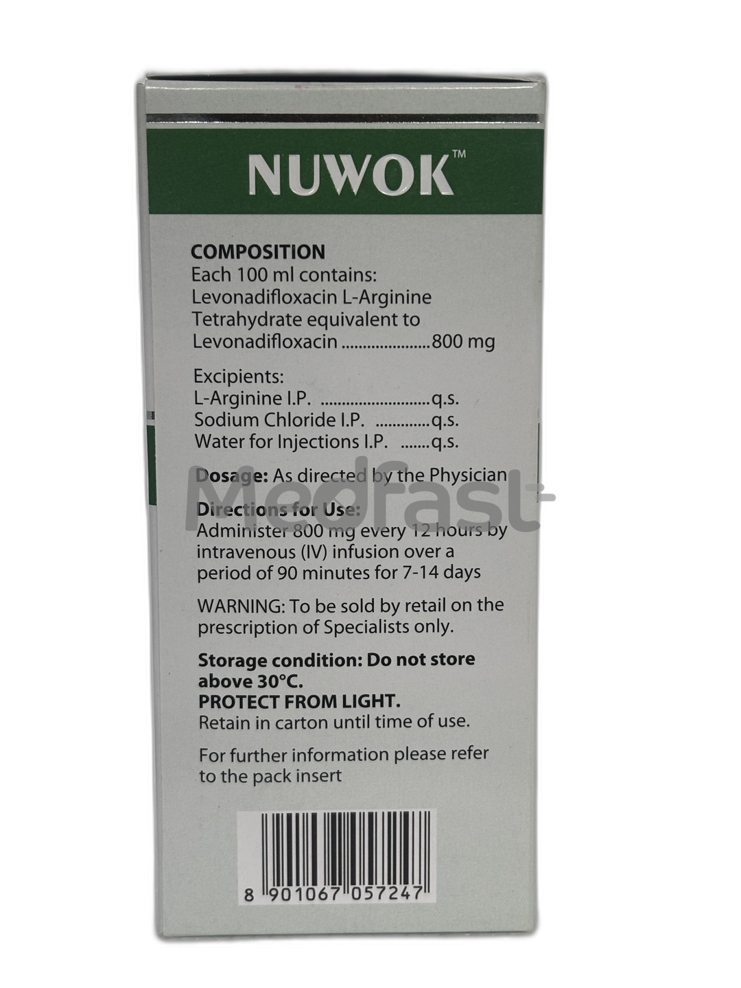 In some cases, Nuwok 800 mg Injection 100 ml may cause side effects such as gastrointestinal disorders and injection site reactions. Most of these side effects do not require medical attention and will gradually resolve over time. However, you are advised to speak to a healthcare professional if these side effects persist or worsen.