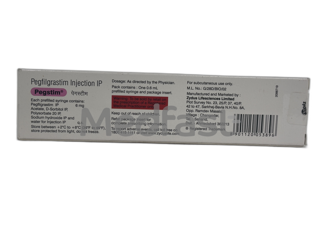 Pegstim 6mg Injection PFS contains Pegfilgrastim, a long-acting form of granulocyte colony-stimulating factor (G-CSF). It is used to reduce the risk and severity of febrile neutropenia, a condition characterized by fever and a dangerously low white blood cell count that often occurs as a side effect of chemotherapy. Pegfilgrastim works by stimulating the bone marrow to produce more neutrophils, a type of white blood cell essential for fighting infections. By increasing the number of these cells, it helps the body better defend itself during periods when the immune system is weakened by cancer treatment.