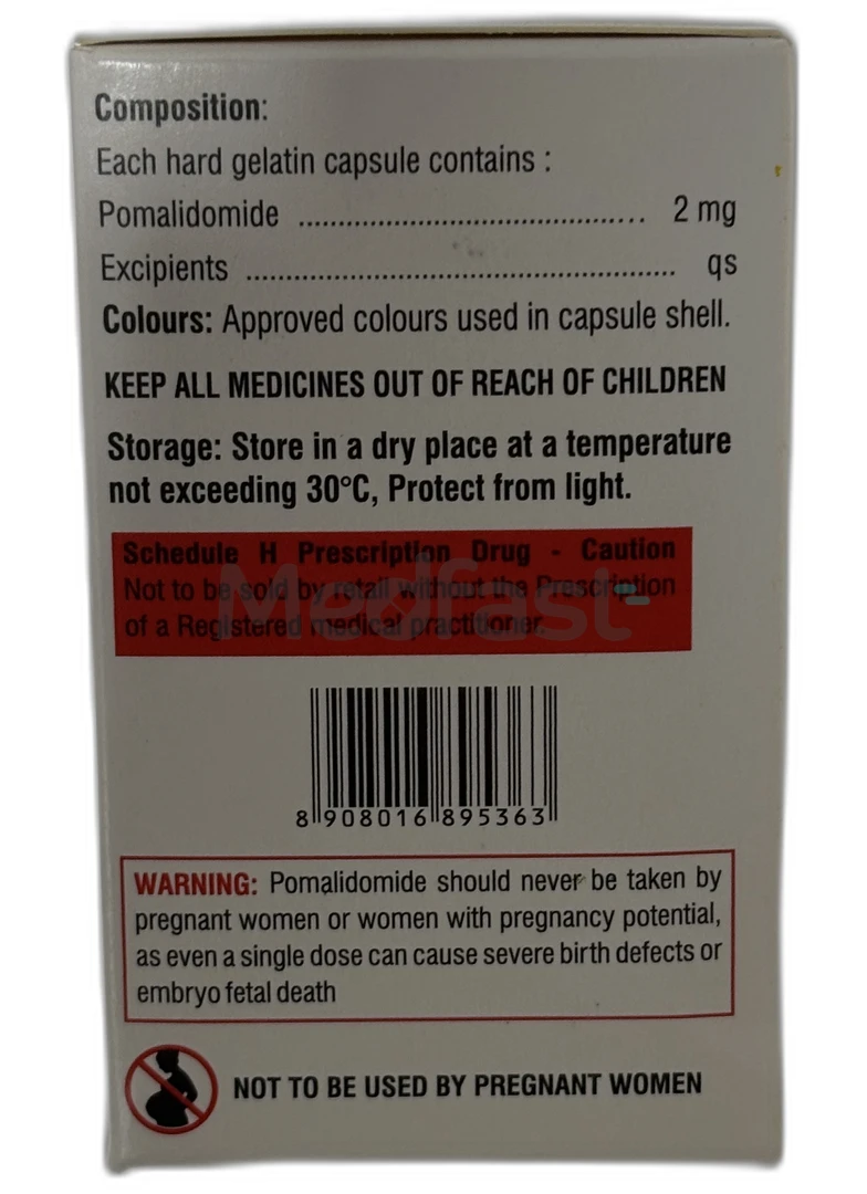 Pomide 2mg Capsule is a chemotherapy drug that contains the active ingredient Pomalidomide. It falls under the category of medications known as immunomodulatory agents. This medication is utilized for the treatment of multiple myeloma in adults. Multiple myeloma is a form of cancer that primarily impacts specific white blood cells known as plasma cells. These cells proliferate uncontrollably and accumulate in the bone marrow, leading to damage to the bones and kidneys.