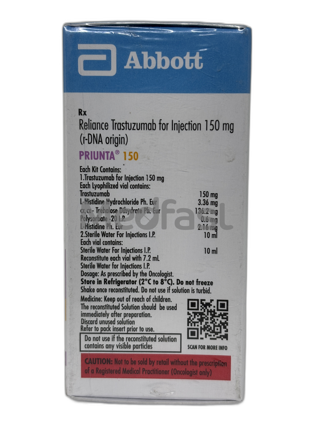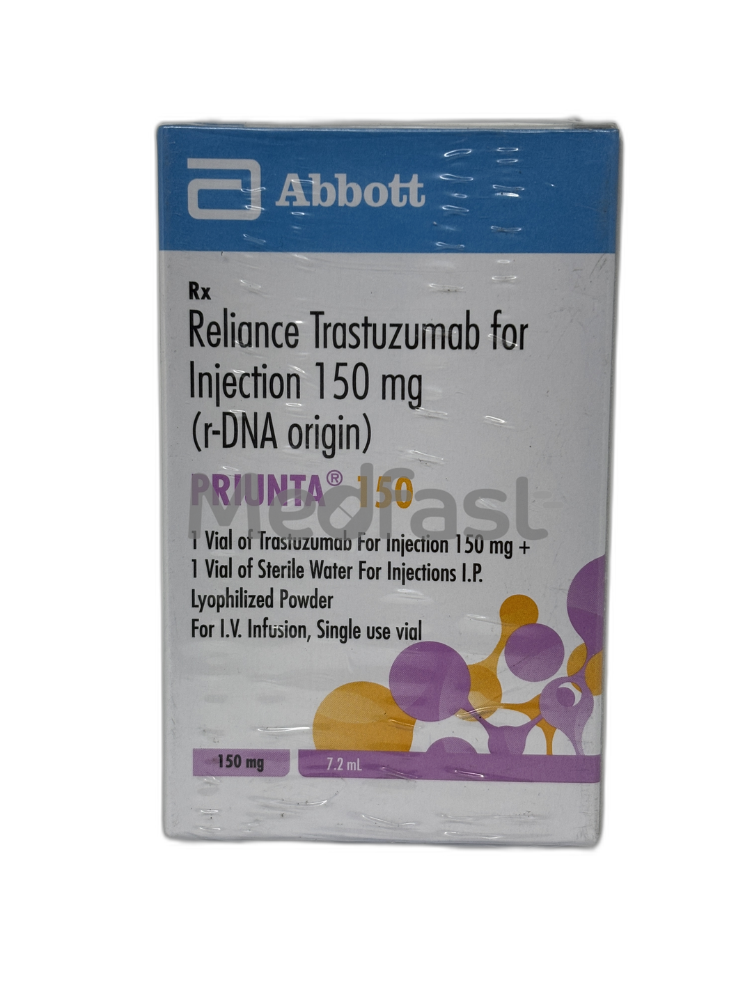 Priunta 150mg Injection consists of Trastuzumab as an active constituent which is indicated for its use in HER 2 breast cancer. In HER 2 positive patients, the breast cancer cells are mostly composed of HER2 proteins that cause rapid development of cancer tumor by serving as a signal to the cancerous. This medication is also used to treat metastatic gastric cancer with increased levels of HER2 proteins.
