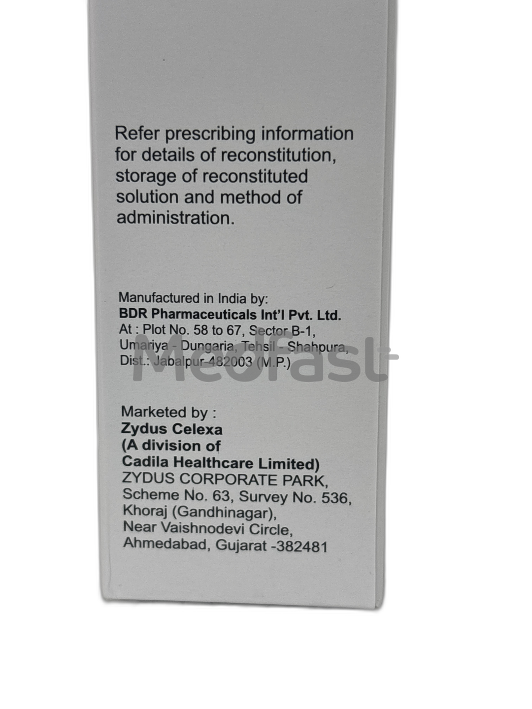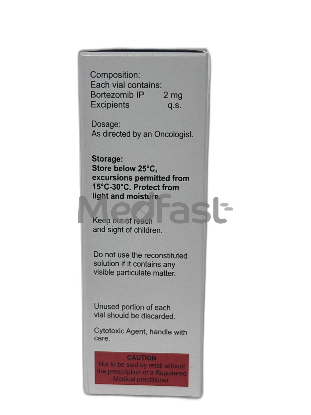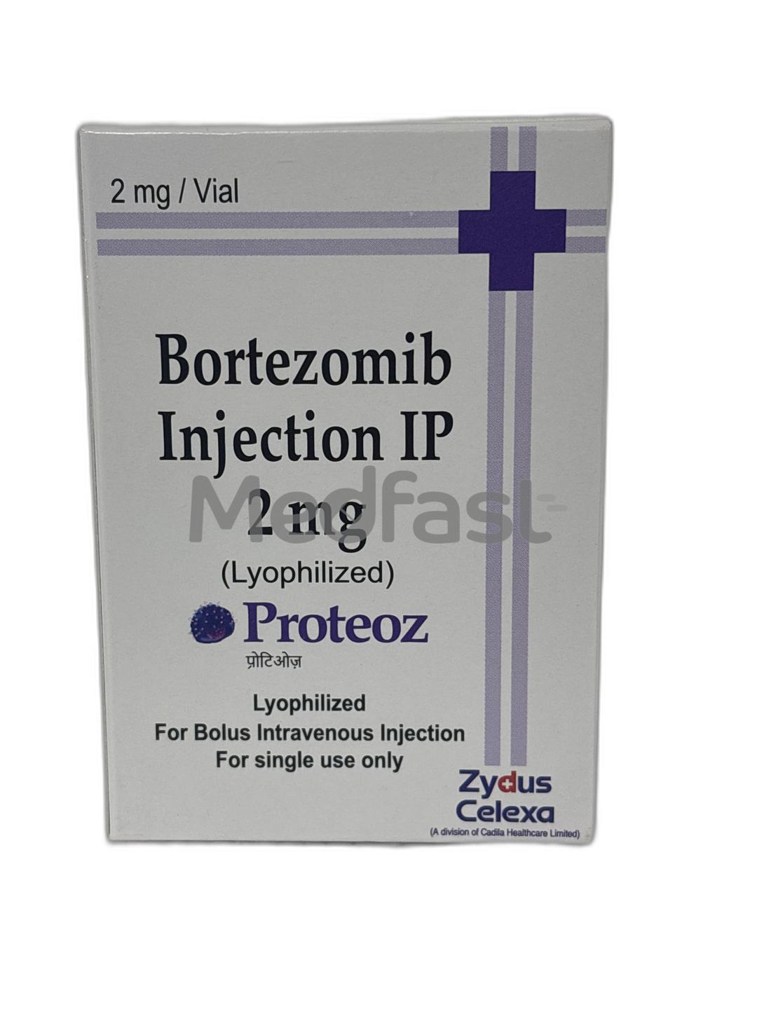 Proteoz 2mg Injection is a chemotherapy medication that belongs to the class of medicines called proteasome inhibitors. It consists of the active ingredient Bortezomib. It is indicated for the treatment of multiple myeloma and mantle cell lymphoma. Multiple myeloma refers to the cancerous progression of plasma cells that are predominant in the bone marrow. Mantle cell lymphoma is a less common cancer affecting the lymph nodes. This medication is concomitantly used with other chemotherapy medicines like pegylated liposomal doxorubicin, rituximab, cyclophosphamide, doxorubicin, dexamethasone, prednisolone or thalidomide for patients who have not started treatment and are ineligible for blood stem cell transplant.