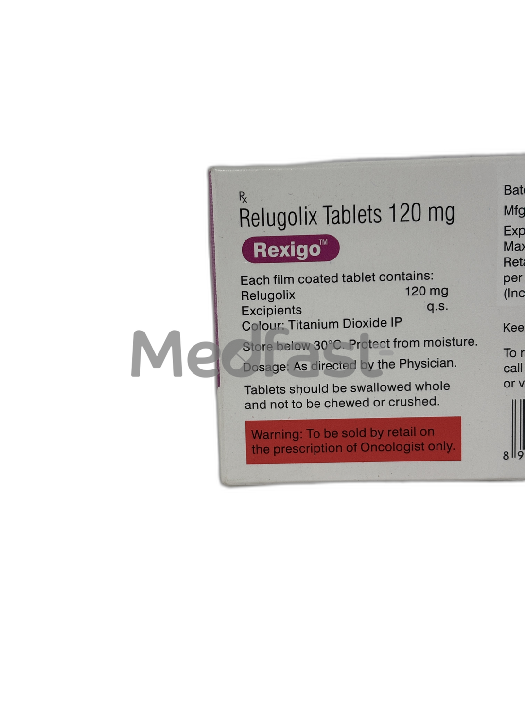 Rexigo 120mg Tablet contains Relugolix, a medication specifically designed to treat advanced hormone-sensitive prostate cancer in adult men. This drug is part of a class of medicines known as gonadotropin-releasing hormone (GnRH) receptor antagonists.