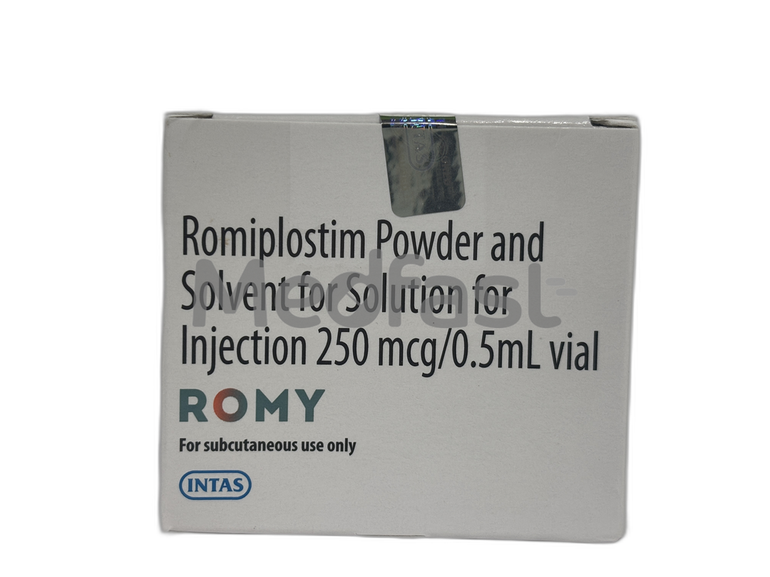 Romy 250 mcg Injection is a platelet-stimulating agent containing the active ingredient Romiplostim. It is used in the treatment of immune primary thrombocytopenia (ITP)—a condition in which the immune system mistakenly destroys the body’s own platelets, leading to abnormally low platelet counts. This injection is prescribed primarily for adults and children aged 18 years and older with ITP who have not responded adequately to prior treatments such as corticosteroids, immunoglobulins, or splenectomy (surgical removal of the spleen).