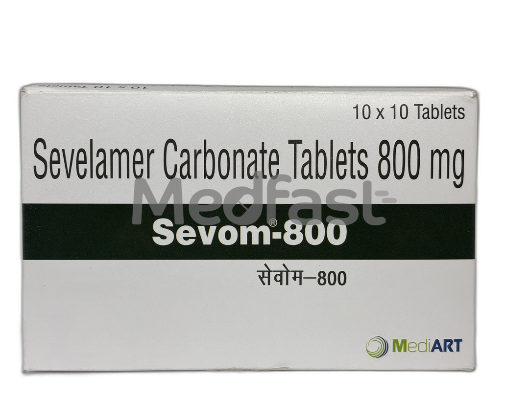 Sevom 800mg Tablet contains an active ingredient called Sevelamer. This medication belongs to the class known as phosphate binders. It is specifically used to effectively manage hyperphosphatemia (a condition characterized by abnormally high blood phosphate levels) in adult patients who are undergoing dialysis (either hemodialysis or peritoneal dialysis), as well as in patients with chronic kidney disease who have elevated serum phosphorus levels. This tablet should be used in conjunction with other treatments, such as calcium supplements and vitamin D, to help prevent bone disease. It is important to understand that persistently high blood phosphorus levels can lead to calcification, a process where hard deposits form and stiffen blood vessels, consequently affecting proper blood flow.