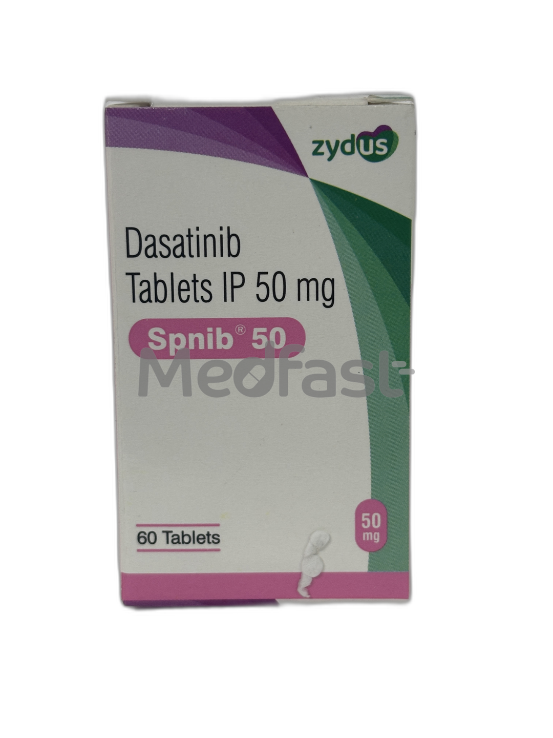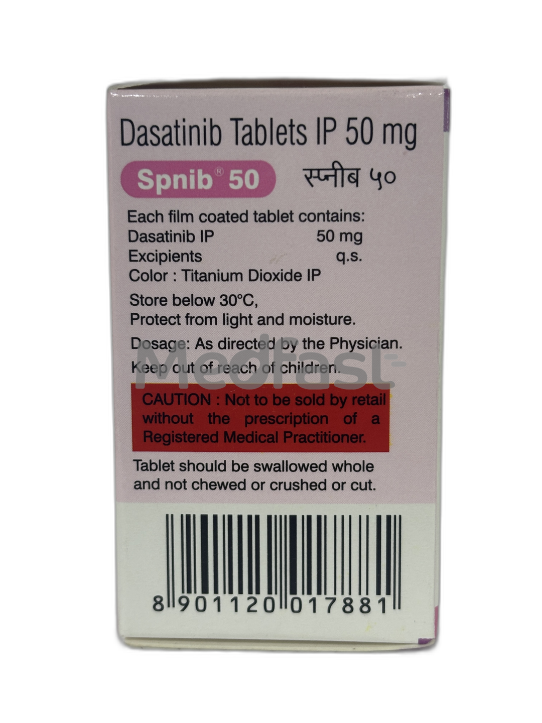 Spnib 50mg tablet consists of the active ingredient Dasatinib. It is prescribed for adults and children above one year of age with Chronic Myeloid Leukemia. This medicine is used to treat newly diagnosed Philadelphia chromosome-positive (Ph+) chronic myeloid leukemia (CML) in the chronic phase and Ph+ acute lymphoblastic leukemia in patients resistant to other therapies. Chronic Myeloid Leukemia refers to a type of blood cancer that makes the body produce too many white blood cells that happen due to alteration in the Philadelphia chromosome. Acute Lymphoblastic Leukemia is the most common form of blood cancer that affects children. In this case, the lymphocytes of white blood cells multiply too quickly and live too long.