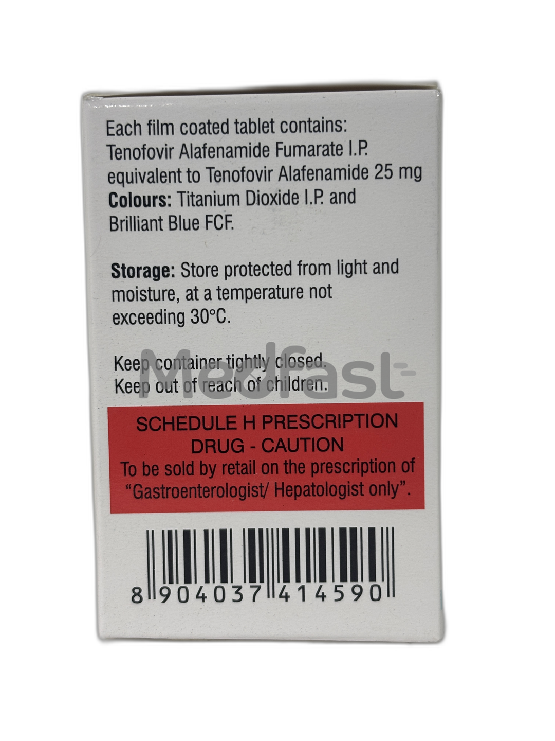 Tafnat 25mg Tablet is an important antiviral medication containing the active constituent Tenofovir alafenamide. It is specifically used to effectively treat chronic hepatitis B virus (HBV) infection. Hepatitis B is a viral infection primarily affecting the liver, caused by the hepatitis B virus itself. It is crucial to discuss with your doctor about the necessary precautions needed to avoid infecting others. Before taking Tafnat 25mg Tablet, you must tell your doctor if you currently have or have ever had kidney diseases, liver diseases, or HIV. Administration of this medicine may, in rare cases, lead to serious conditions such as lactic acidosis (an accumulation of excessive acid in the blood) and hepatomegaly (an abnormally enlarged liver).