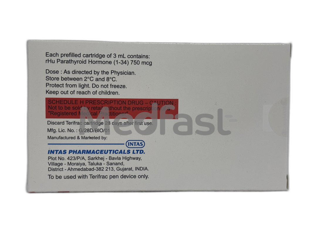 Terifrac 750mcg Injection contains the active ingredient Teriparatide, a synthetic form of human parathyroid hormone (PTH). It is primarily used to manage osteoporosis—a condition characterized by brittle and fragile bones that are more prone to fractures. By mimicking natural PTH, Terifrac stimulates the activity of osteoblasts (bone-forming cells), thereby enhancing bone formation, improving bone mineral density, and accelerating fracture healing. It is particularly beneficial in reducing the risk of spinal and other types of fractures in individuals at high risk.