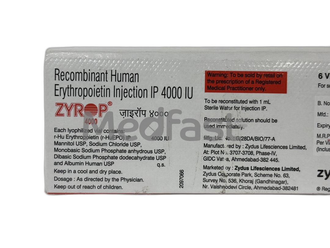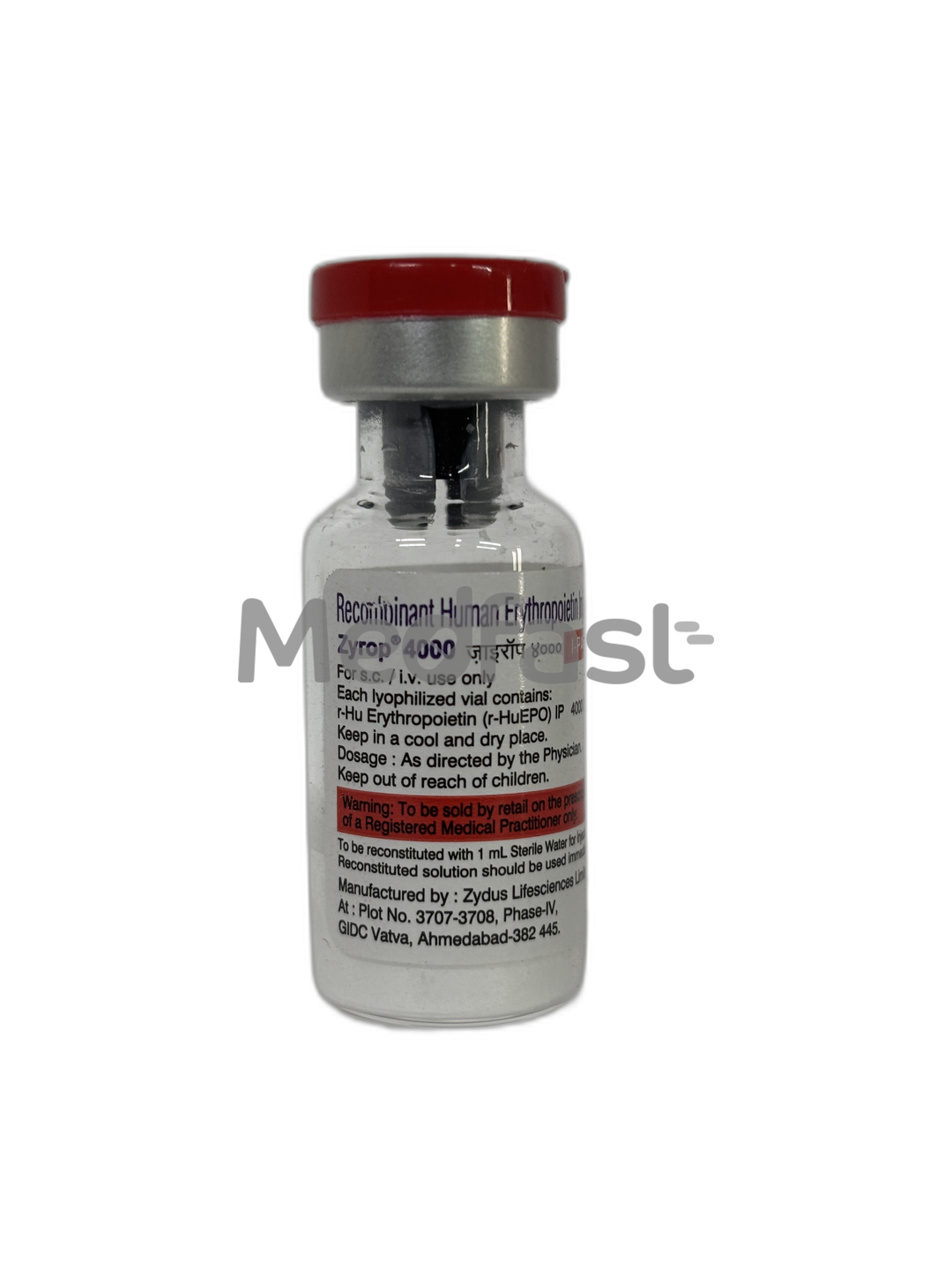 Zyrop 4000IU injection works by stimulating the bone marrow to produce more red blood cells. Red blood cells carry oxygen to the body's tissues, so increasing the number of red blood cells can help to treat anemia.