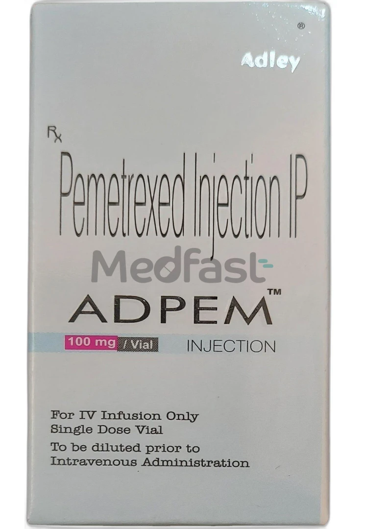 Adpem 100mg Injection is an anticancer medicine containing the active ingredient pemetrexed. It belongs to the medication class known as an antifolate agent. It is used to treat non-small cell lung cancer and malignant pleural mesothelioma (cancers of the lungs and chest). Adpem 100mg Injection is given alone or in combination with another anticancer medicine, such as cisplatin. Your doctor may prescribe corticosteroids, folic acid, and vitamin B12 to limit the side effects.