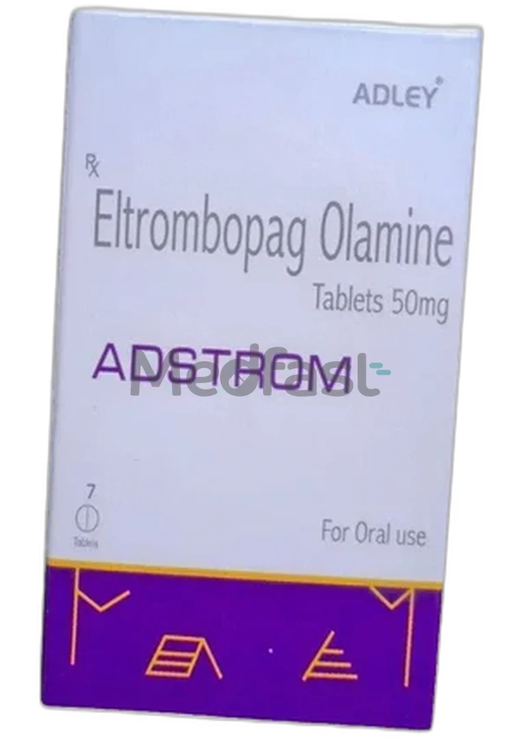 Adstrom 50mg tablet are an anticoagulant drug belonging to the thrombopoietin (TPO) receptor agonist category, containing the active ingredient Eltrombopag. It treats low platelet counts caused by primary immune thrombocytopenia (ITP) or hepatitis C (HCV) infection. ITP refers to an autoimmune disorder in which the immune system destroys platelets. Platelets are blood cells that aid in clotting and protect blood vessel walls. When platelet levels are low, it can result in severe bleeding and bruising. This tablet is also used in adults to treat low blood counts caused by severe aplastic anaemia (a serious blood disease that occurs when the bone marrow fails to produce enough new blood cells).