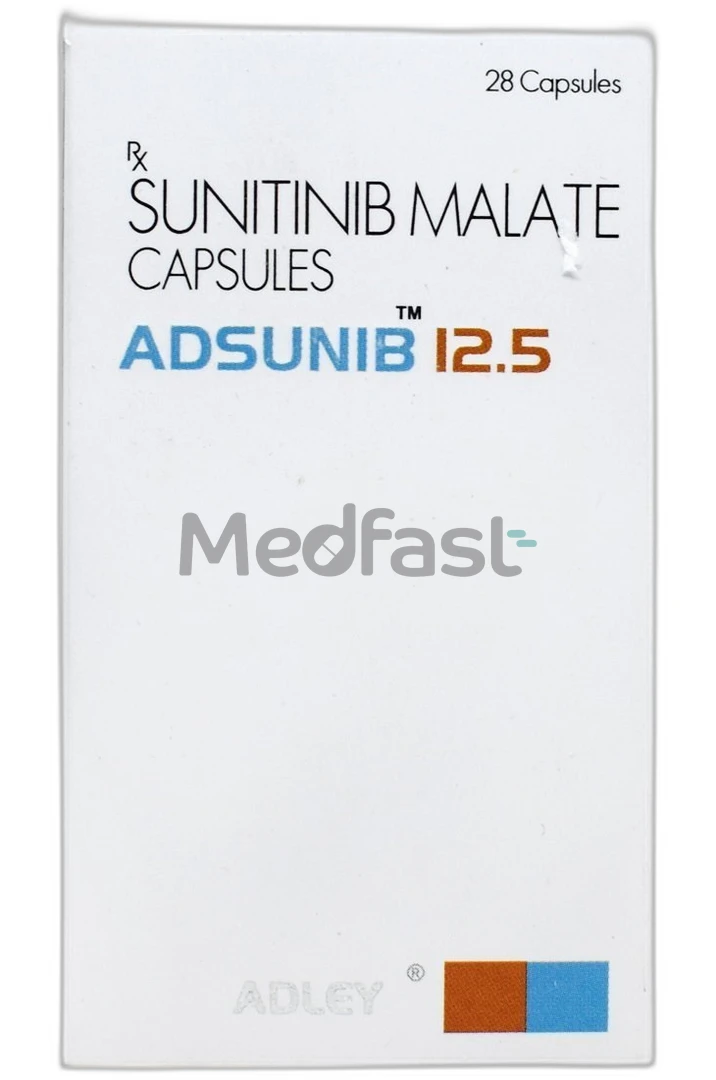 Adsunib 12.5mg Capsule is taken orally, in the form of capsules, with a glass of water. The capsules should be swallowed whole and not crushed, chewed, or opened. The recommended dose may vary depending on the type of cancer being treated, the patient's age and weight, and other factors. This medication is usually taken once a day, with or without food, at around the same time each day. If you miss a dose then do not double the dose to compensate for the missed dose.