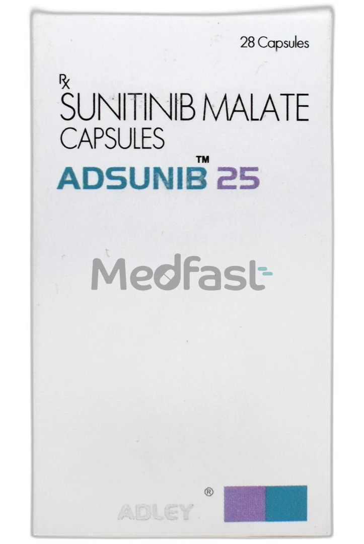 Adsunib 25mg Capsule contains the active ingredient Sunitinib. It is categorized as a tyrosine kinase inhibitor, meaning it functions by inhibiting specific enzymes known as tyrosine kinases that play a role in the growth and dissemination of cancer cells. This medication is utilized for the treatment of gastrointestinal stromal tumors (GIST), a rare type of cancer that can originate anywhere within the gastrointestinal tract. Additionally, it is prescribed for advanced kidney cancer and pancreatic cancer, specifically pancreatic neuroendocrine tumors (PNET). Cancer is characterized by the uncontrolled growth of abnormal cells. It is not advisable for individuals under the age of 18.