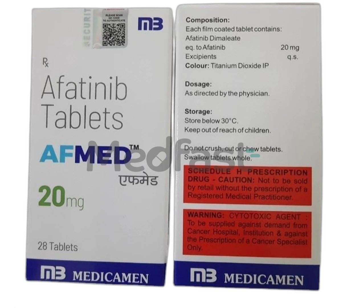 Afmed 20mg Tablet is an anticancer medication that contains Afatinib dimaleate as its active component. It is prescribed for patients diagnosed with non-small cell lung cancer (NSCLC) whose tumors exhibit specific (non-resistant) abnormal epidermal growth factor receptor (EGFR) genes, as well as for those with metastatic squamous NSCLC that has progressed following platinum-based chemotherapy.