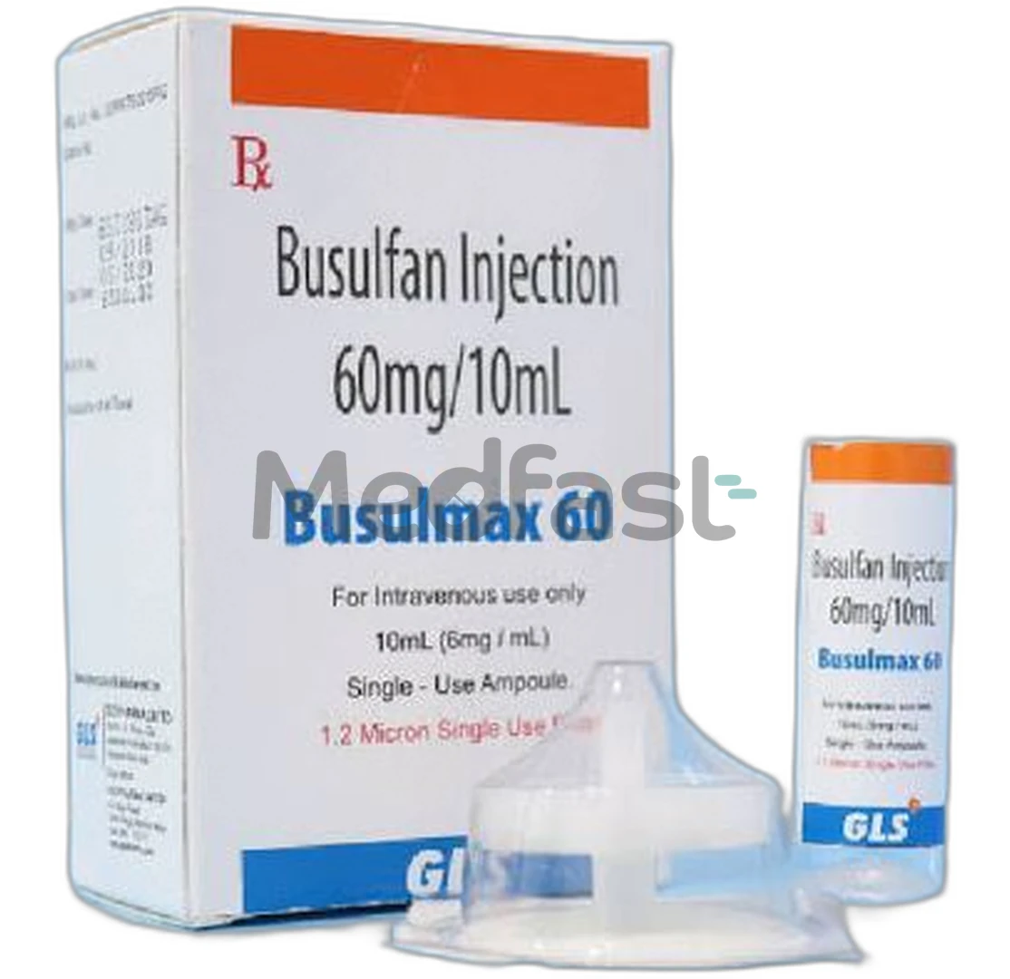 Busulmax 60mg Injection is utilized for treating certain blood cancers, such as chronic myeloid leukaemia. It is administered alongside other cancer therapies during hematopoietic progenitor cell transplantation (HPCT). Additionally, it may be prescribed for various other cancer types.