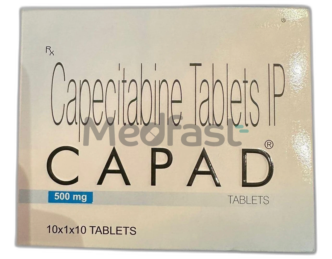 Capad 500mg Tablet contains capecitabine as its active ingredient. It falls under the category of antimetabolite medications. This drug is utilized alongside other anticancer therapies for treating metastatic colorectal cancer and breast cancer. Cancer is characterized by the abnormal and uncontrolled proliferation of cells. Additionally, it is employed to prevent the recurrence of cancer in the colon following the complete surgical removal of a tumor.