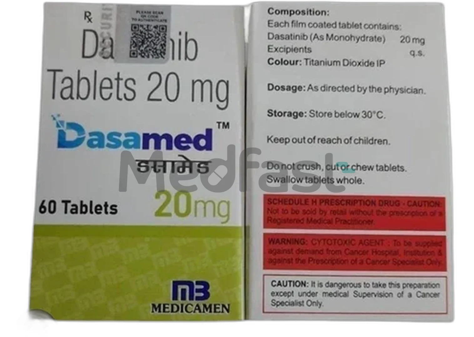 Dasamed 20mg tablet contains the active ingredient Dasatinib. It is prescribed for both adults and children over one year old who have Chronic Myeloid Leukemia. This medication is utilized to treat newly diagnosed Philadelphia chromosome-positive (Ph+) chronic myeloid leukemia (CML) during the chronic phase, as well as Ph+ acute lymphoblastic leukemia in patients who are resistant to other treatments. Chronic Myeloid Leukemia is a type of blood cancer characterized by the excessive production of white blood cells due to changes in the Philadelphia chromosome. Acute Lymphoblastic Leukemia is the most prevalent form of blood cancer in children, where the lymphocytes, a type of white blood cell, multiply rapidly and have an extended lifespan.