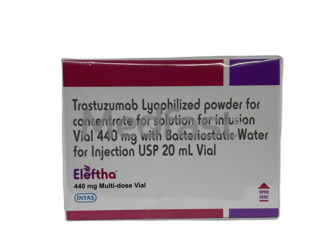 Eleftha 440mg Injection consists of Trastuzumab as an active constituent which is indicated for its use in HER 2 breast cancer. In HER 2 positive patients, the breast cancer cells are mostly composed of HER2 proteins that cause rapid development of cancer tumor by serving as a signal to the cancerous. This medication is also used to treat metastatic gastric cancer with increased levels of HER2 proteins.