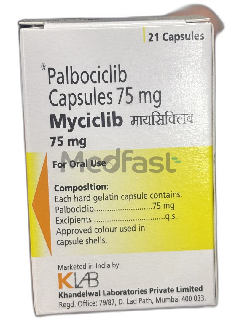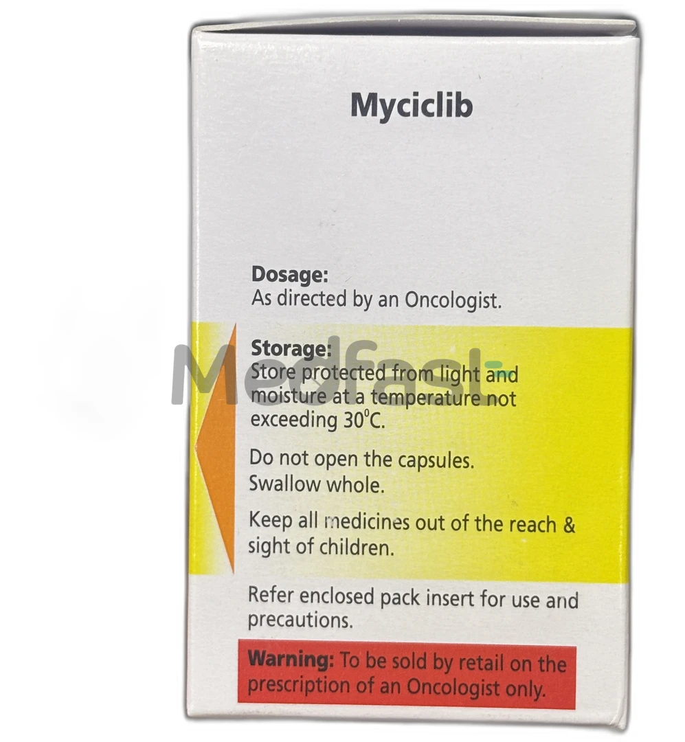 Myciclib 125mg capsule is a targeted therapy that contains the active ingredient palbociclib. This medication falls under the category of anticancer drugs known as cyclin-dependent kinase inhibitors. It is utilized for the treatment of hormone receptor-positive, human epidermal growth factor 2 negative advanced or metastatic breast cancer, which has spread to other areas of the body. Cancer is characterized by the uncontrolled and abnormal proliferation of cells. This medication is administered alongside certain other anticancer drugs.