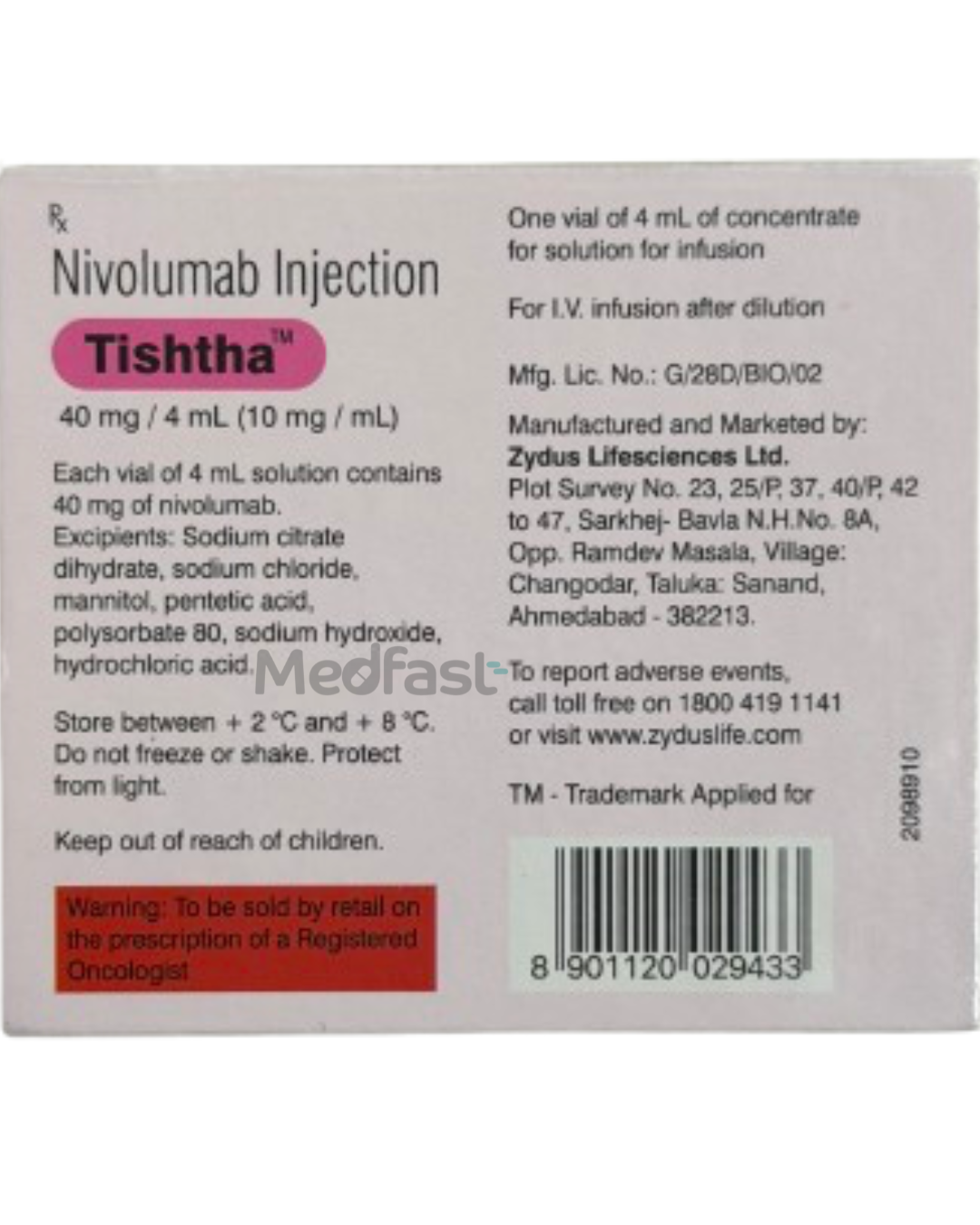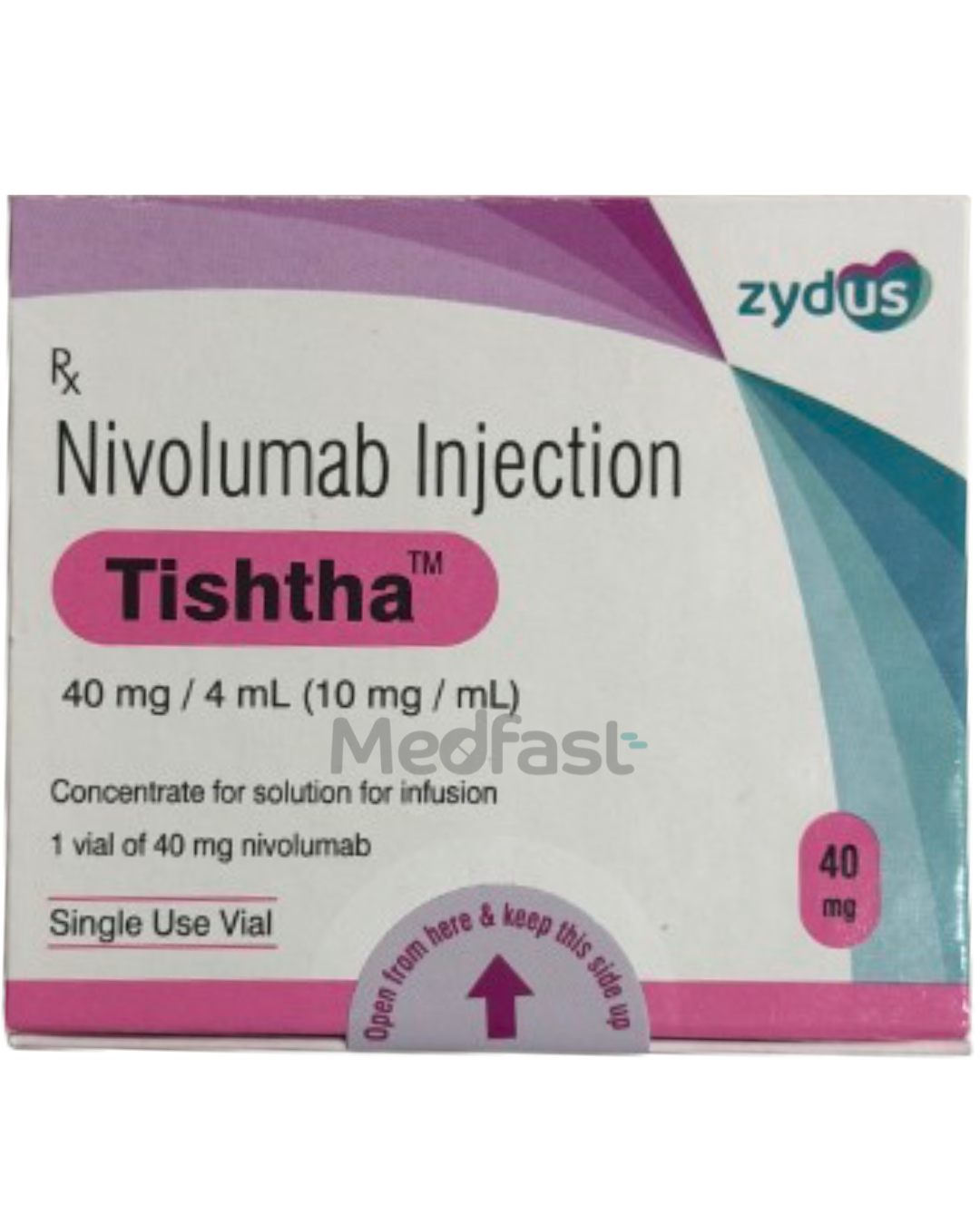 Tishtha 40mg Injection contains the active ingredient Nivolumab. It is used to treat various cancers, including those of the skin, lungs, kidneys, lymph nodes, bladder, oesophagus, and urinary tract. This medication is recommended when cancer has returned after previous treatments such as medication, surgery, and radiation. It aids the immune system in combating cancer more effectively.
