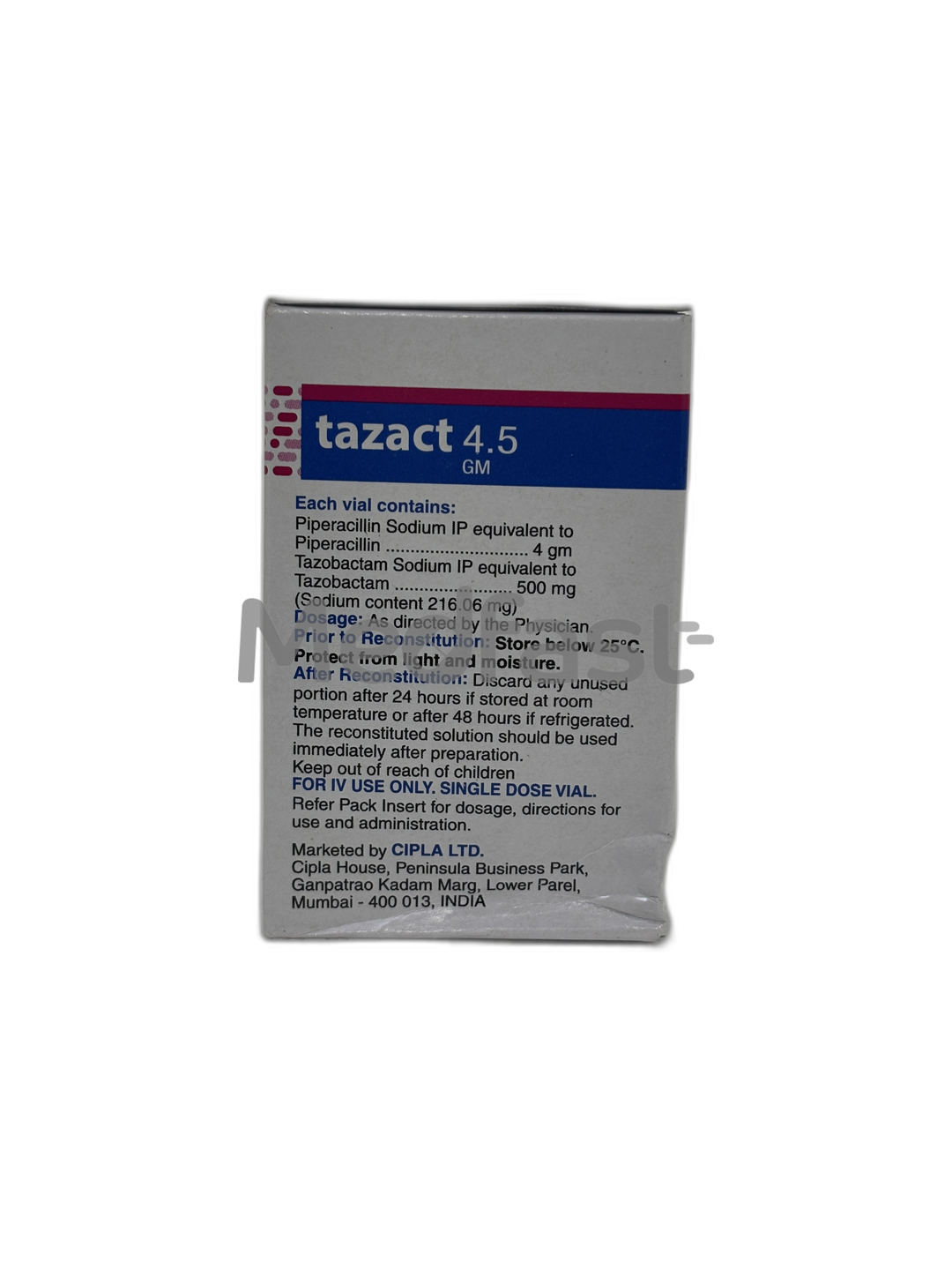 Tazact 4.5gm Injection is a powerful combination of two distinct antibiotics that is effectively used to treat various types of serious bacterial infections. It actively fights against these infections by comprehensively killing the disease-causing microorganisms.