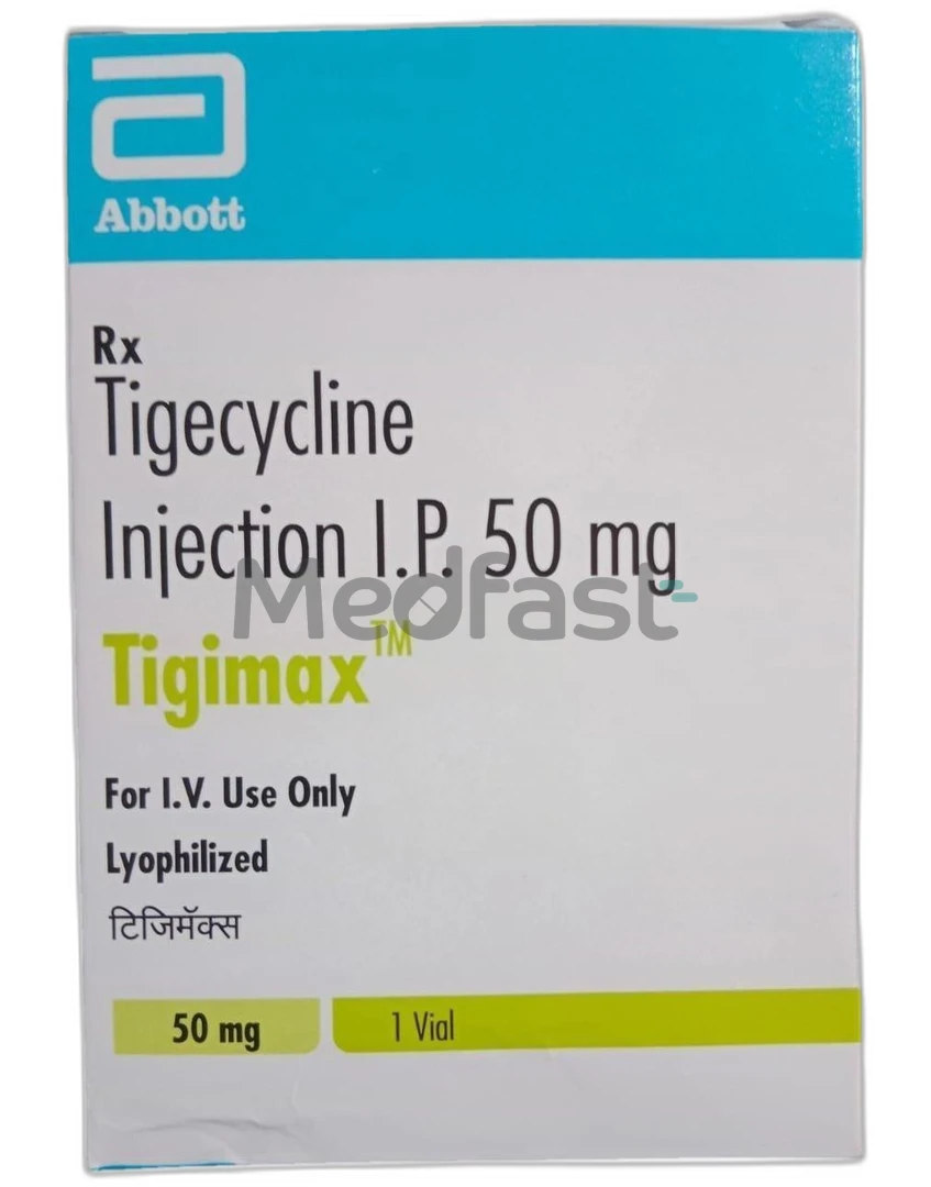 Tigimax 50mg injection is an antibiotic belonging to the tetracycline class, with Tigecycline as its active ingredient. It is primarily used to treat severe bacterial infections affecting the skin and abdomen. This medication is not advised for children younger than eight years old. Tigimax is generally reserved for cases where other antibiotics are deemed unsuitable or ineffective for specific infections.