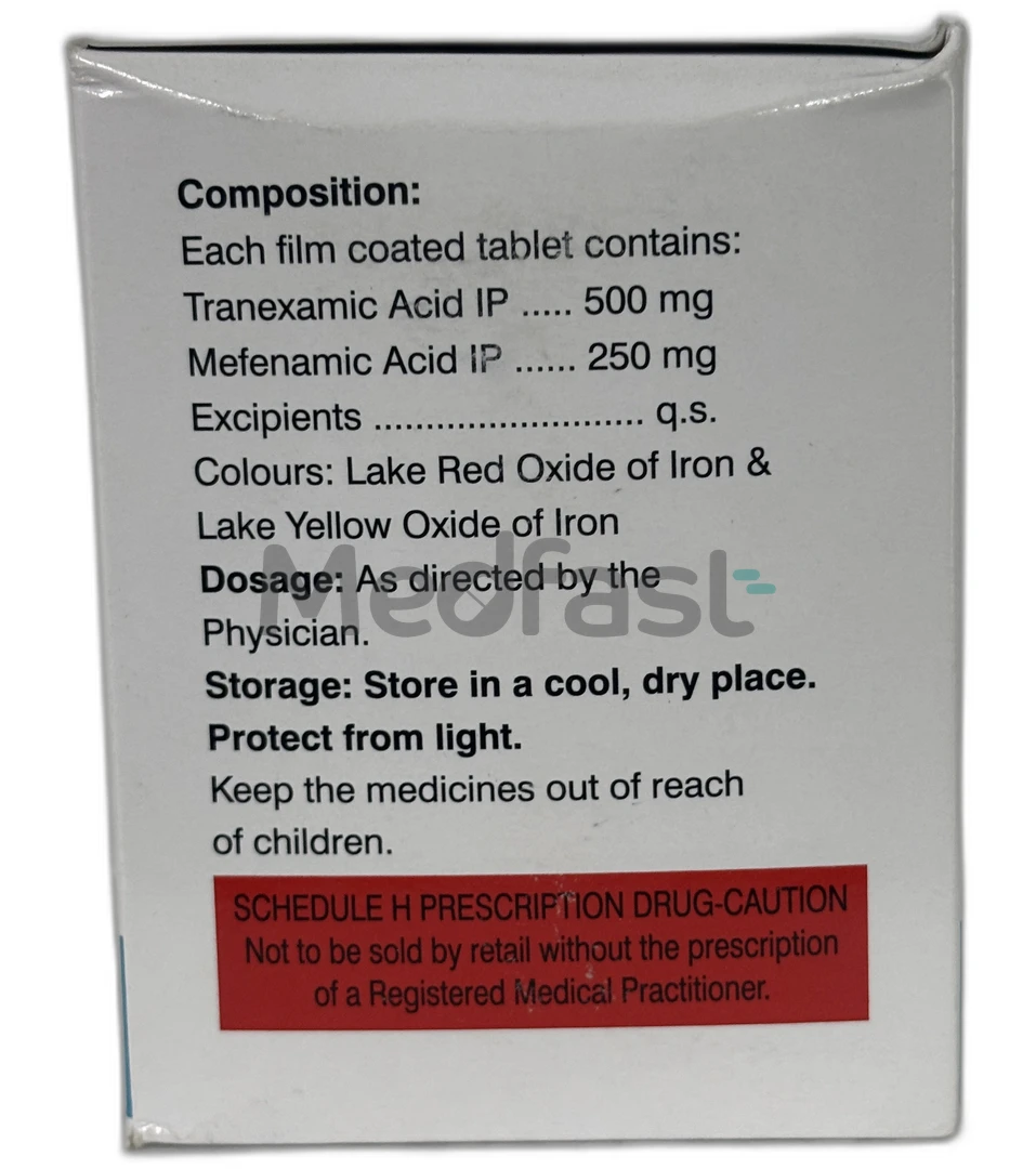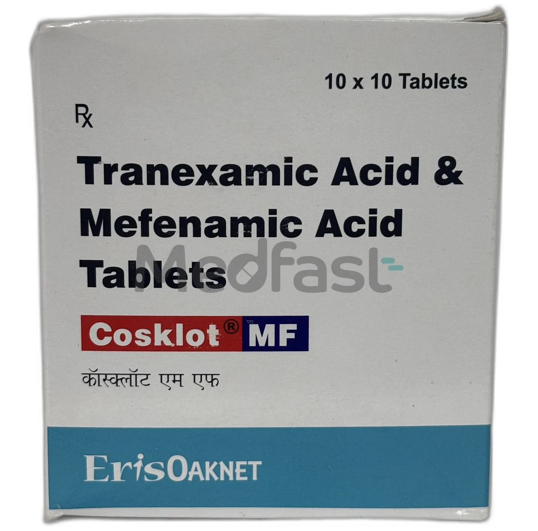 Cosklot MF Tablet consists of two active ingredients: Tranexamic acid (an anti-fibrinolytic) and Mefenamic acid (a non-steroidal anti-inflammatory drug, NSAID). Tranexamic acid aids the body’s natural blood clotting process by inhibiting the breakdown of fibrin, thereby preventing fibrinolysis, which is the process that hinders blood clot formation. Mefenamic acid functions by blocking the action of chemical signals that induce pain.