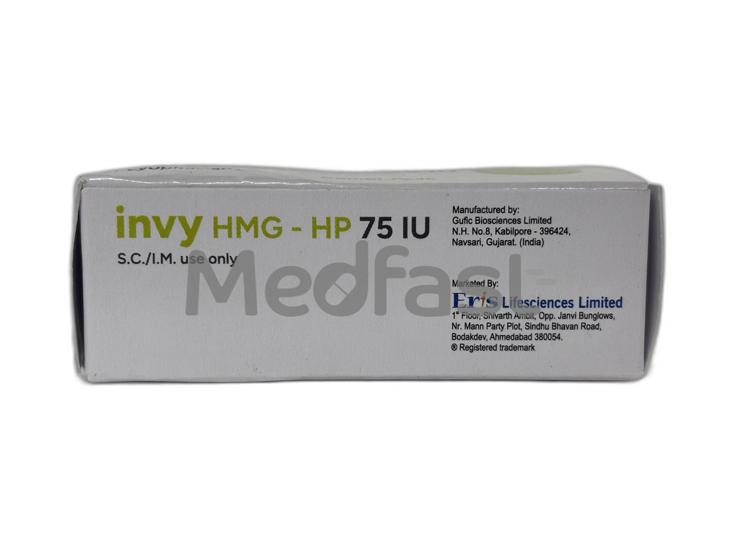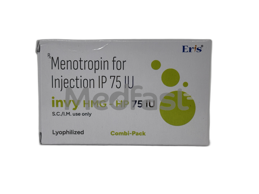 Invy HMG HP 75IU Injection, containing the active substance Menotrophin, is an ovulation stimulator categorized under gonadotropins. It is a highly purified combination of follicle-stimulating hormone (FSH) and luteinising hormone (LH), both of which are naturally occurring hormones essential for the normal functioning of reproductive organs in both males and females.