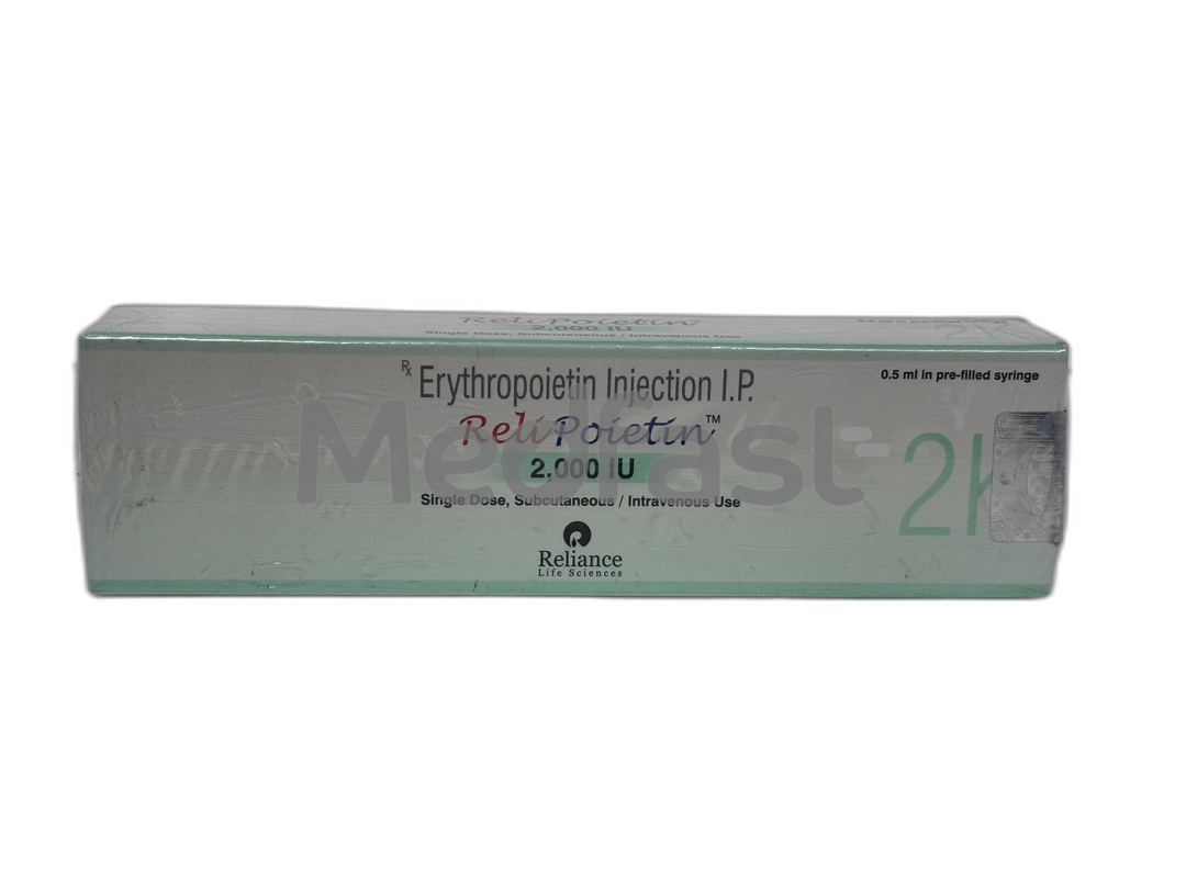 Relipoietin 2000 IU Injection is administered subcutaneously, meaning it is injected under the skin. Common injection sites include the abdomen, thigh, or upper arm, as these areas allow for better absorption of the medication